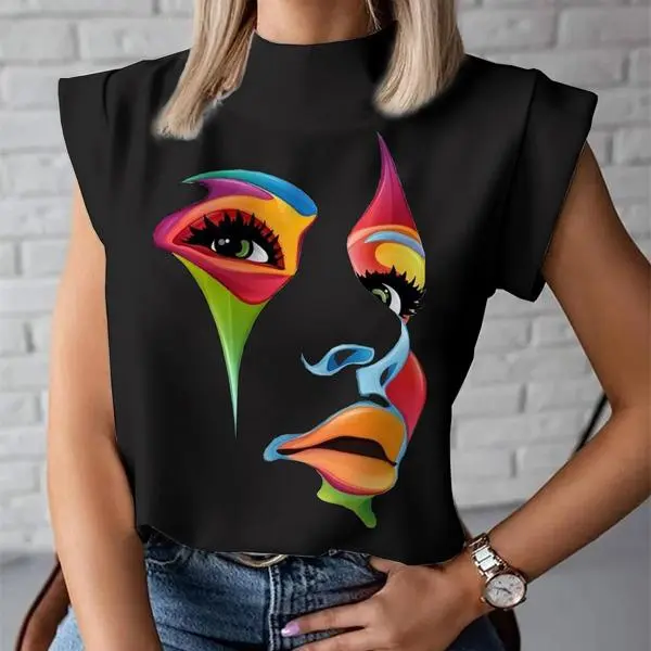Women's summer comfortable casual cap sleeve loose 3D human face print high collar T-shirt top, daily leisure, comfortable and breathable cute shirt Womenswear Tshirt