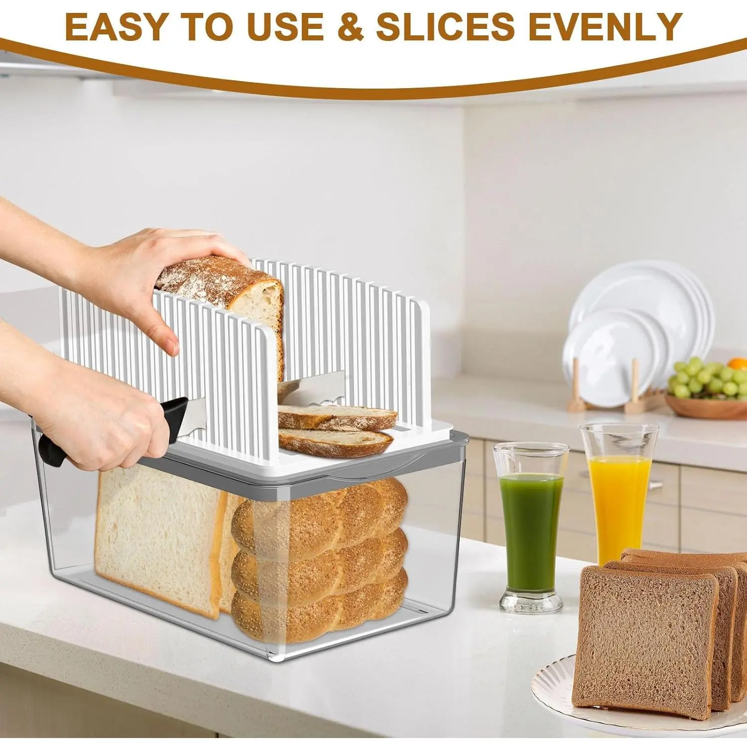 UPGRADE MULTI-FUNCTIONAL BREAD BOX: Our upgrade bread slicer for homemade bread comes with a 9L large capacity bread boxes made of high quality makings, The crumb collector can be as a bread box lid for easy storage of bread for homemade bread, toast, bagel, donut, cookies, fruits and vegetables for kitchen counter and fridge