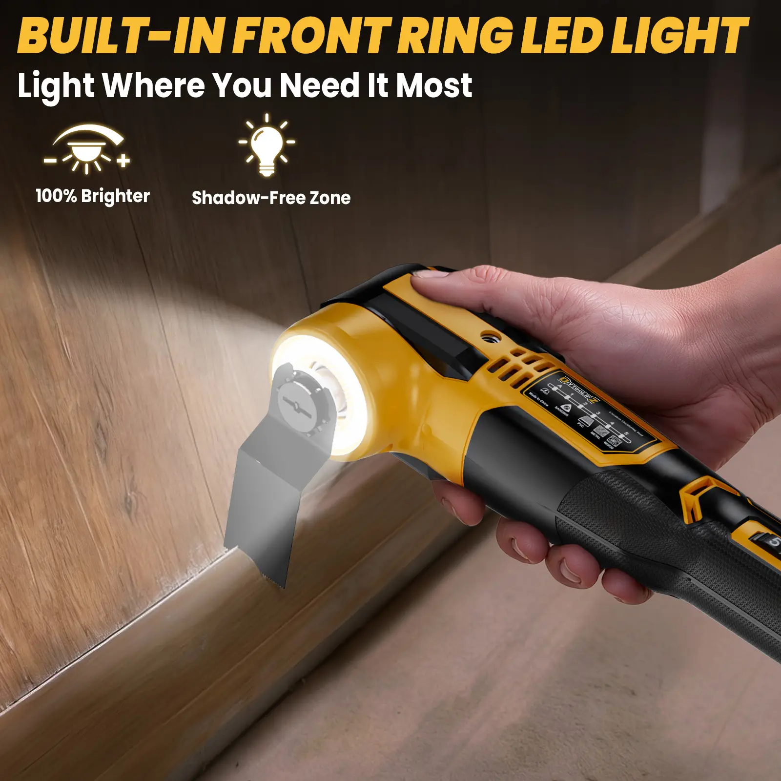 ·【Zero Obstruction Total Vision】-This next-generation oscillating tool is engineered with a side-plug battery design , eliminating interference when working flush against walls or flat surfaces. This enables true zero-clearance cutting in tight or low-profile applications, preventing angled cuts caused by battery obstruction.A front-mounted LED halo offers shadow-free illumination across the entire work area, ensuring a clear line of sight to the blade or sanding pad.