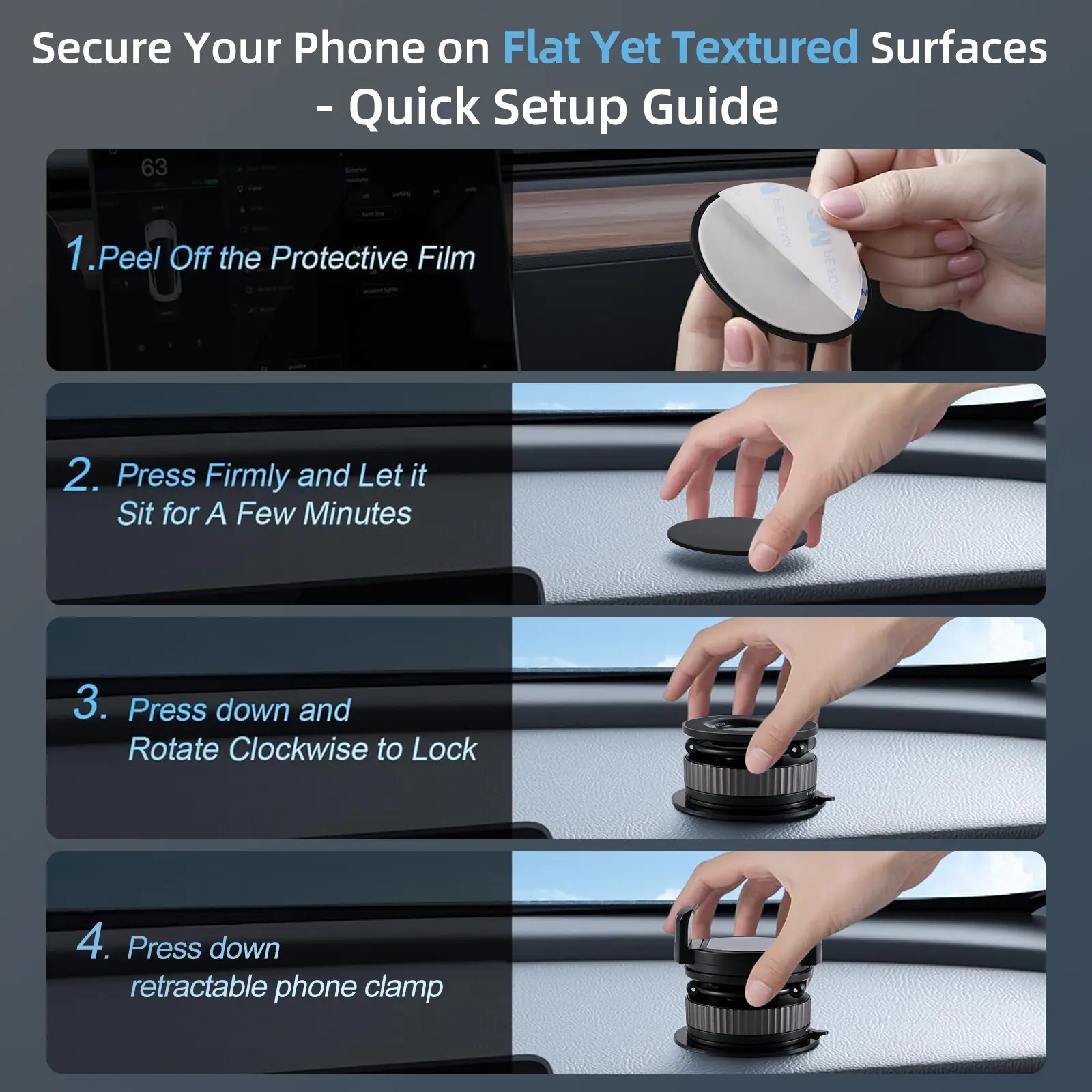 • ️IMPORTANT: ️ Use the Included Adhesive Pad for smooth yet textured surfaces to ensure a secure mount. Avoid mounting on fluctuating or uneven surfaces. ️Use the Included Magnetic Ring for Non-Magnetic Phones and Phone Cases NOT RECOMMENDED Mounting the Adhesive Pad on Uneven Car Dashboard. How to Check Surface Smoothness Without the Adhesive Pad: Scratch a circle with your fingernail—if the surface feels smooth and makes no sound, it’s suitable for mounting without the adhesive pad.