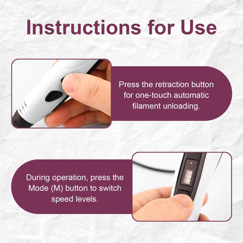 [BEGINNER FRIENDLY] Plug the adapter into the back of the pen and choose your filament. The red light will turn on indicating warm up, this will take about 2-3 mins. Double click the forward button to start and feed the filament through the back of the pen. Once the filament has reached the nozzle of the pen, click forward to stop. Press and hold the forward button or double click for a continous flow. Once you have completed your design, press and hold the reverse button to retract filament.