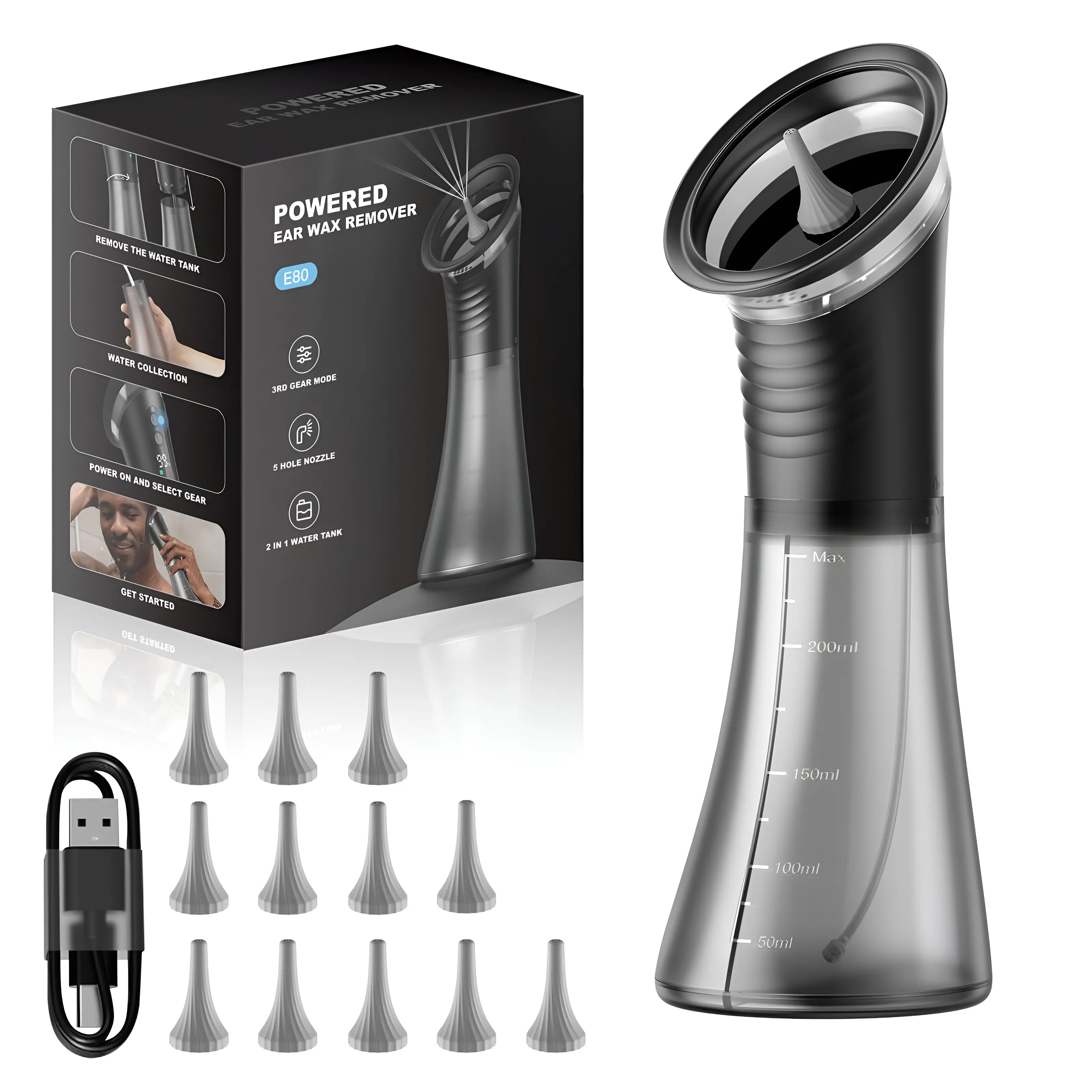 【Ear cleaning kit contains】: Upgraded ear wax remover * 1, One-hole nozzles * 4, Three-hole nozzles * 4, Five-hole nozzles * 4, Type-C charging cable * 1, Instruction Manual * 1