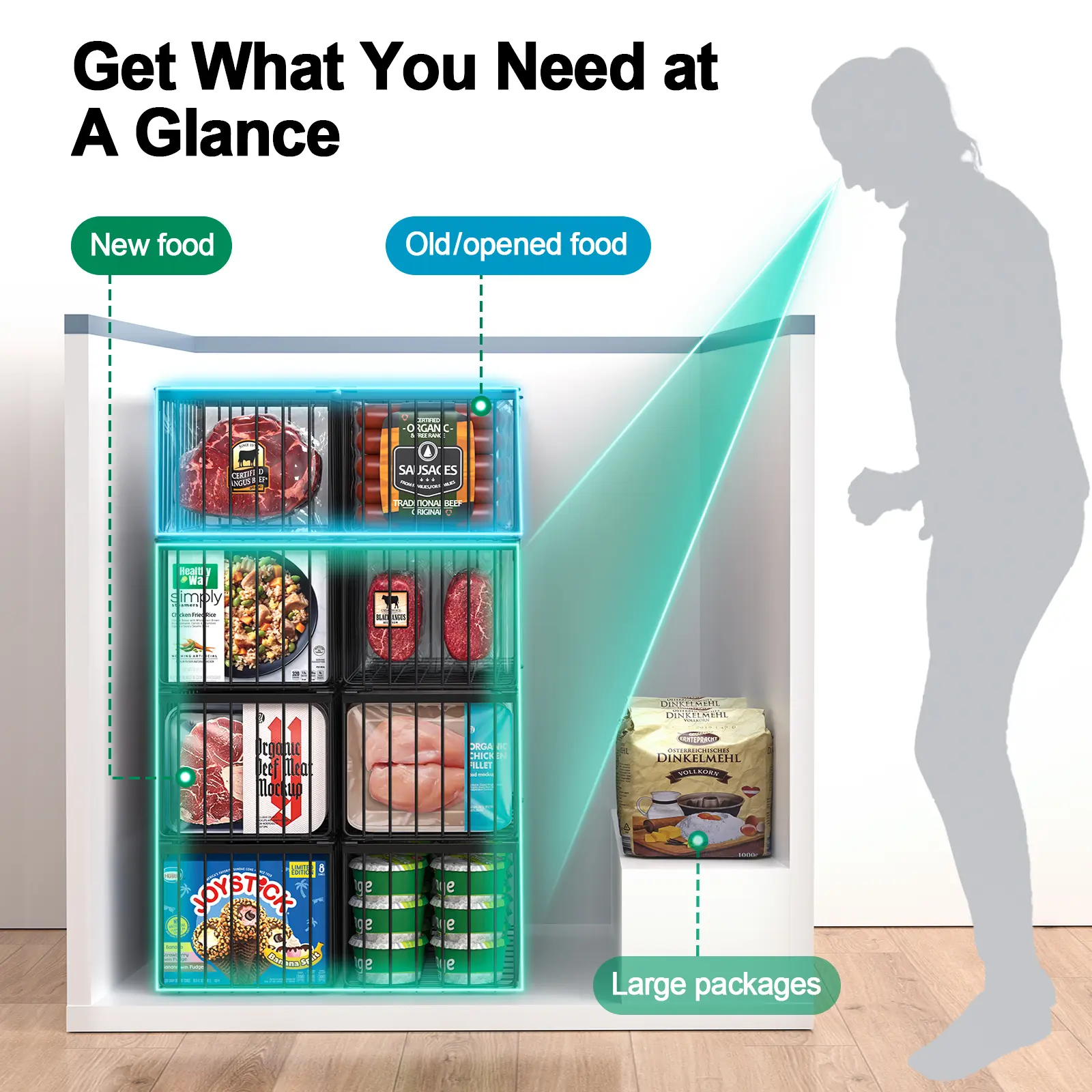 Handles tuck in for easy stacking. Lift to grab what you need. Not using them? Just fold flat and store. The open-frame design lets cold air circulate freely, keeping your food fresher longer. 🔄