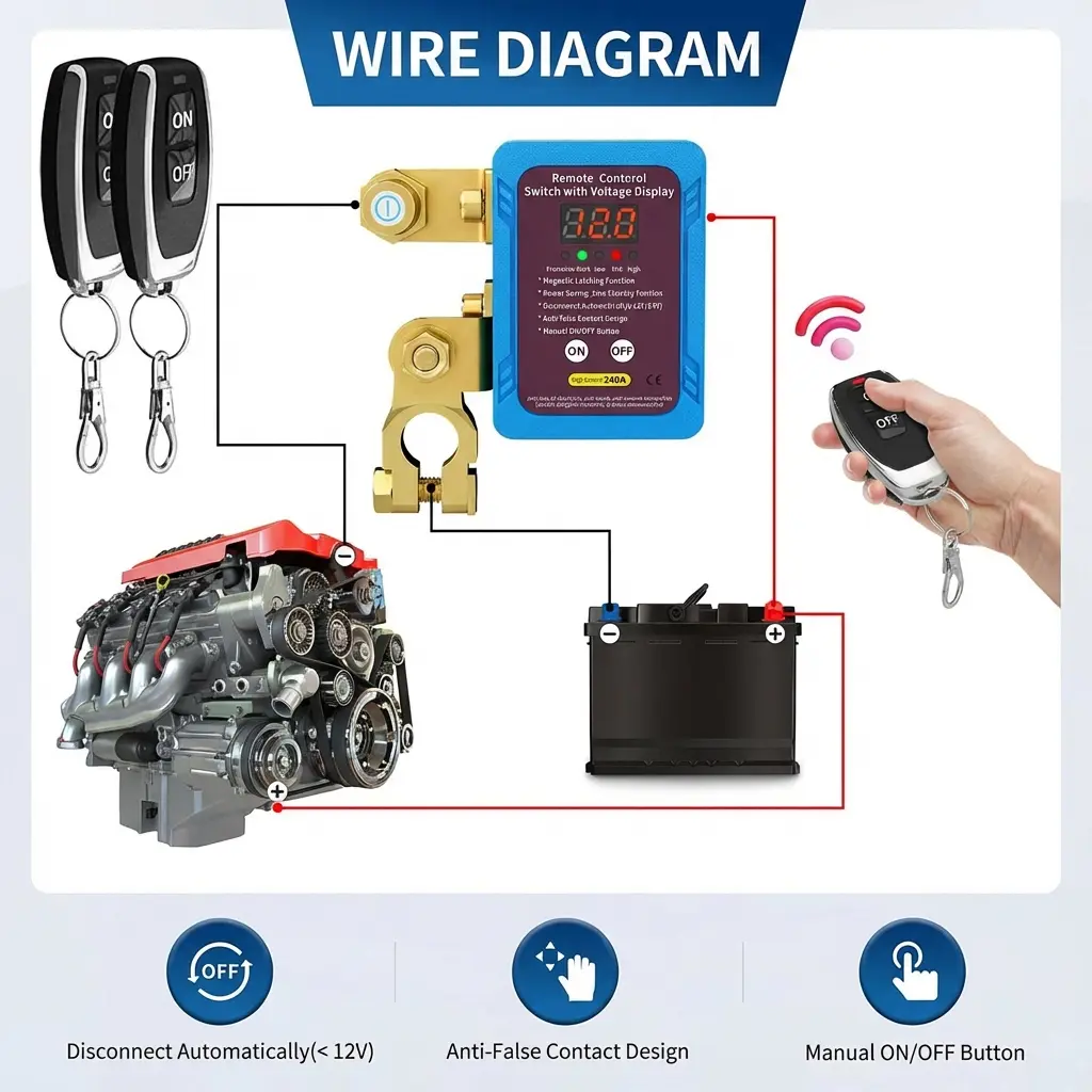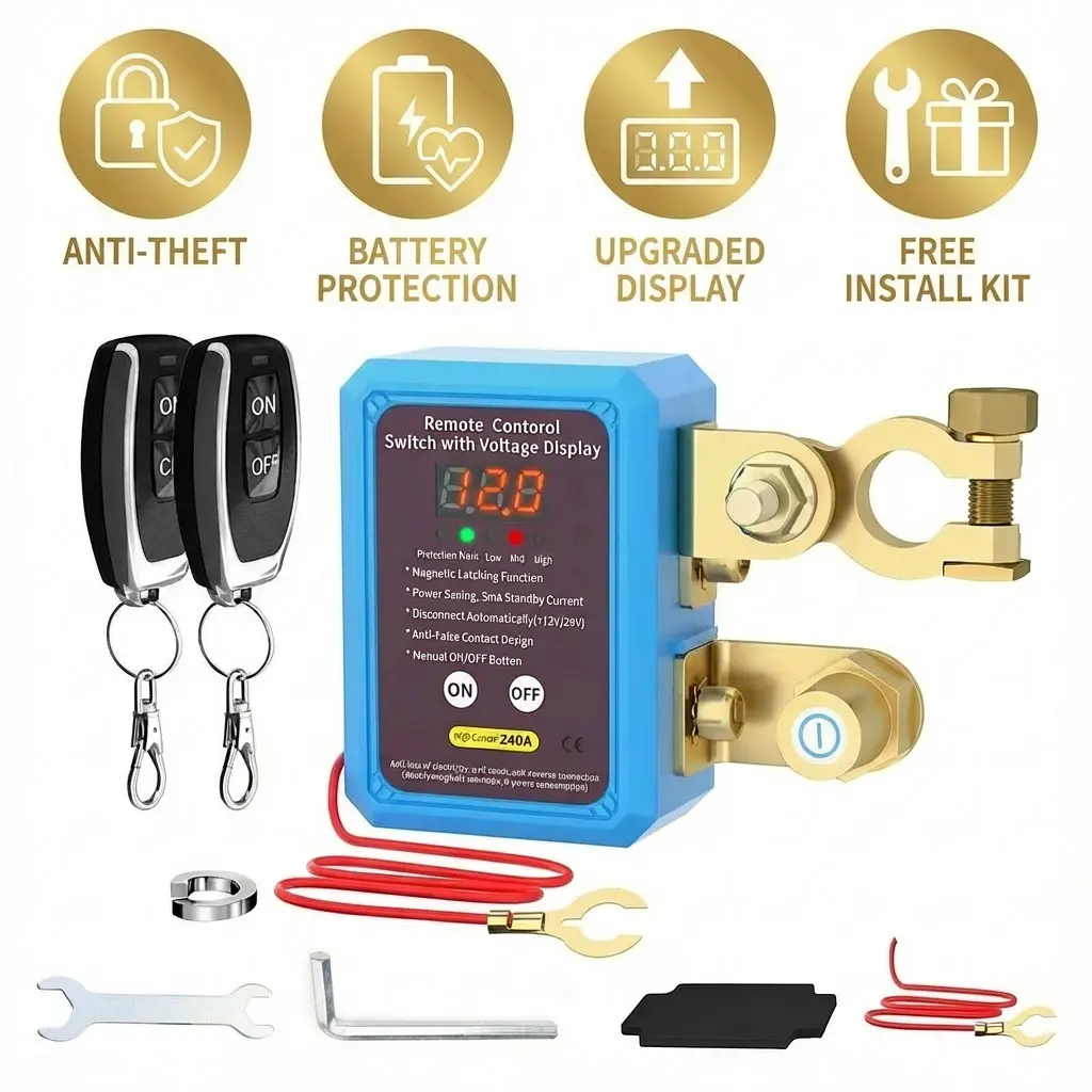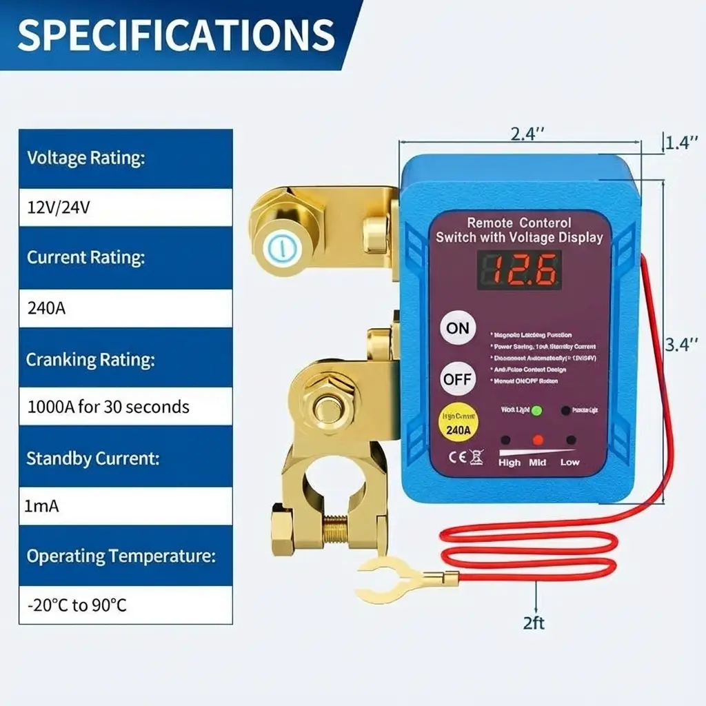 Upgraded Remote Battery Disconnect Switch 12V/24V 240A with Digital Voltage Display Anti-Theft Battery Protection Car Truck RV Boat Includes Remote & Wiring Accessory