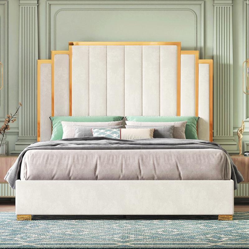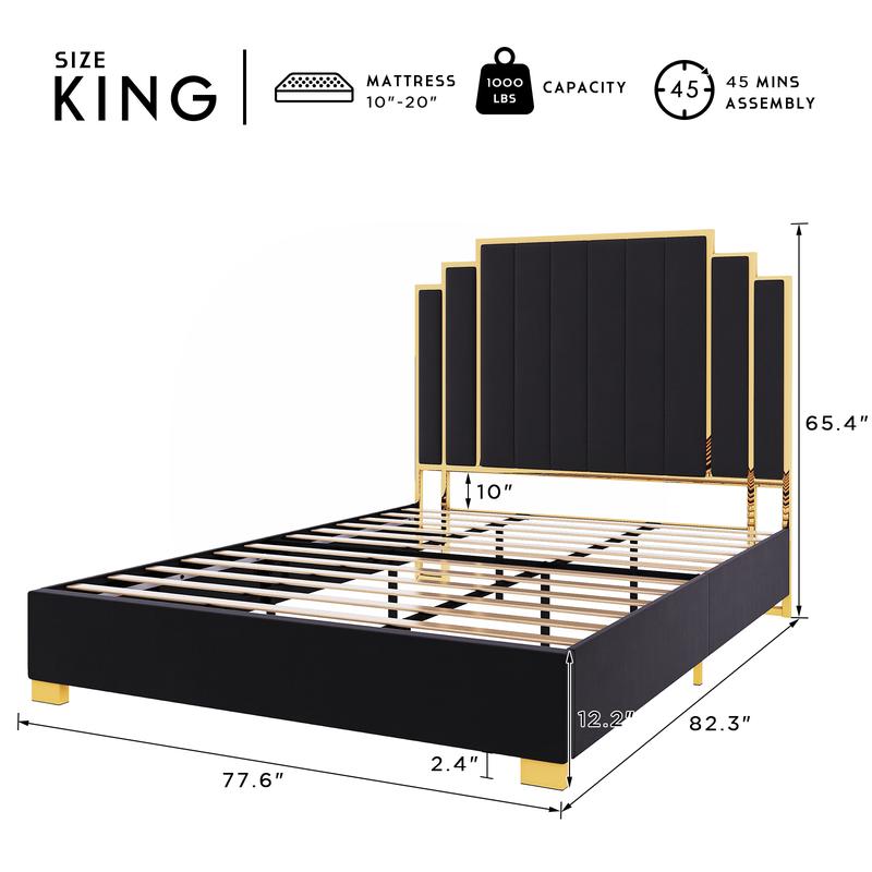 ·ăModern StyleăSoft velvet upholstered side rails flow into a 65â vertical channels headboard, supported by gold legs, the king bed frame is contemporary and plush looking.