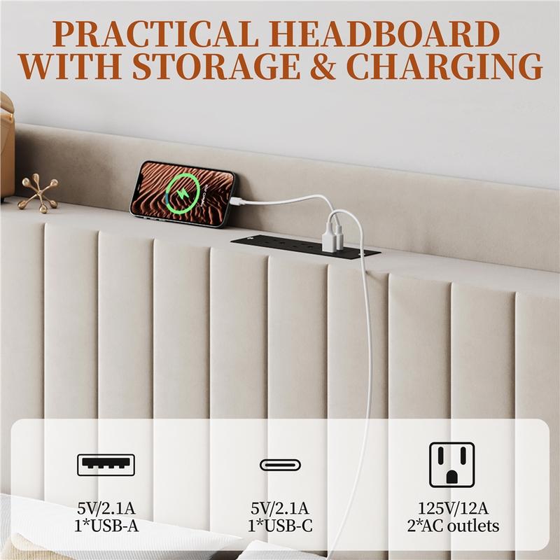 2. Convenient Charging: The upholstered headboard features a built-in adapter at the center with a 6.6 ft round cord, two USB ports (USB-A & USB-C), and two AC outlets, eliminating messy power stations and providing effortless charging for all your devices