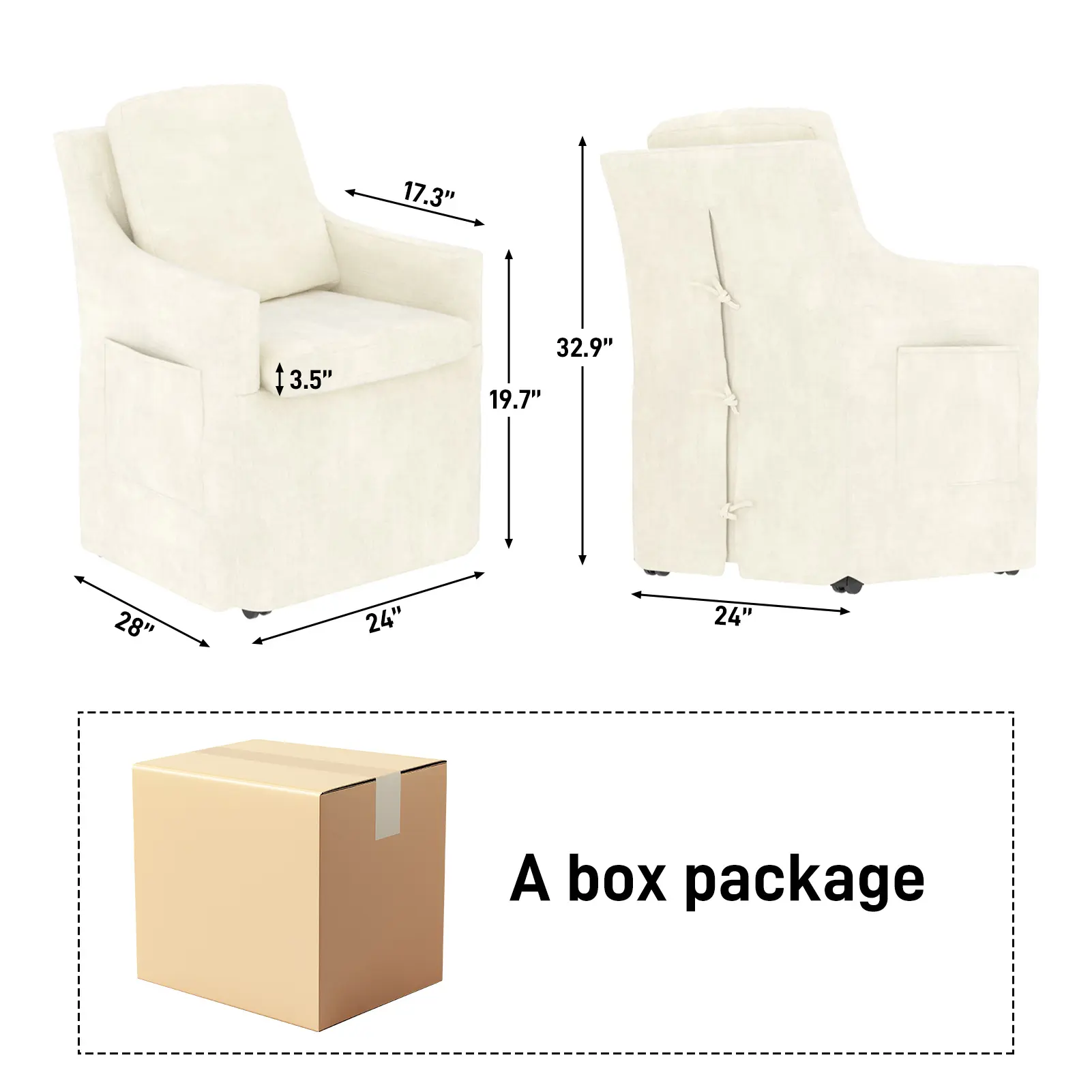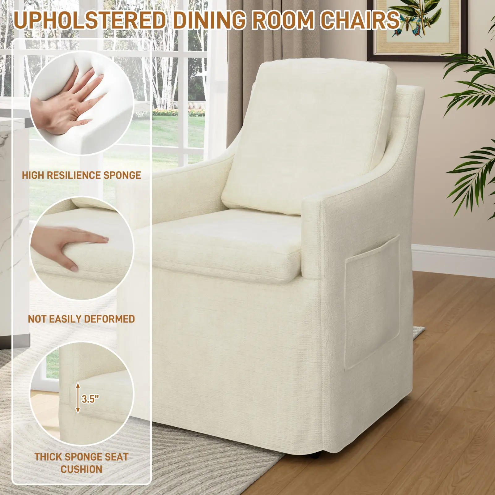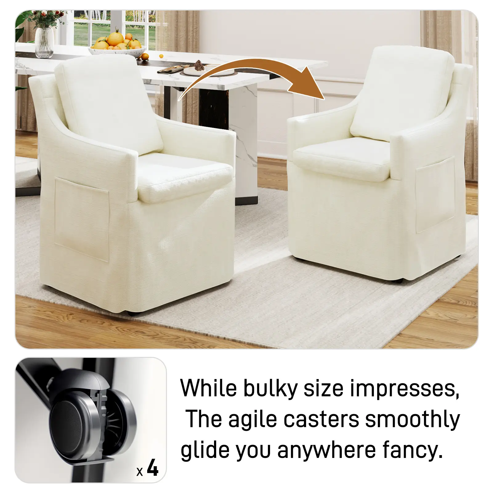 Four quiet, concealed casters let this chair glide 360° smoothly. Move it easily between dining room, bedroom, or even outdoors—rearrange your space in seconds. Casters stand up to daily use for long-lasting convenience.