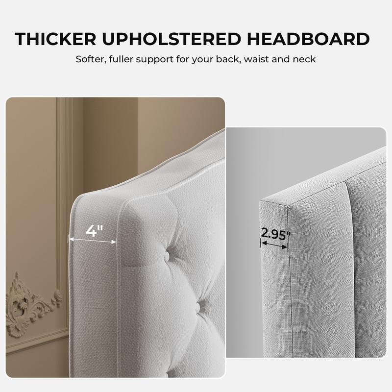 ¡ăExtra-Thick 4 In Cushionă: The generously padded cushion of queen headboard, filled with high-density, high-resilience foam, offers enhanced support for your back, waist, and neck. Enjoy a more comfortable posture while reading, watching TV, or using your laptop or phone in bedâeven for extended periodsâwithout the discomfort of soreness or strain.