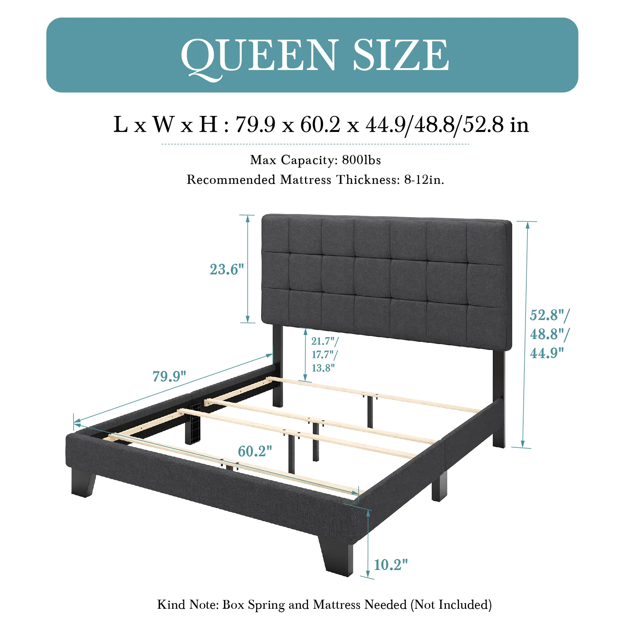 ·ADJUSTABLE HEADBOARD: Three available height choices, 44.9’’ ,48.8’’ and 52.8’’ , are provided to satisfy your various kinds of needs
