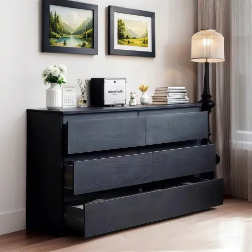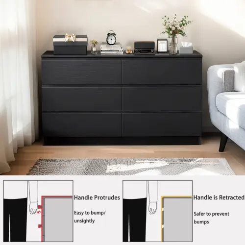 ·{Multi-Scene Application} This 6 drawer black dresser can be easily integrated into every corner of the home with its excellent adaptability. In the bedroom, it is an expert in clothing storage, in the living room, it becomes a master of book and sundry sorting, in the home office, it becomes a file management assistant, and it can also serve as a makeup cabinet and TV cabinet. Such a practical and beautiful home good thing, as a gift to relatives and friends, shows your thoughtfulness.