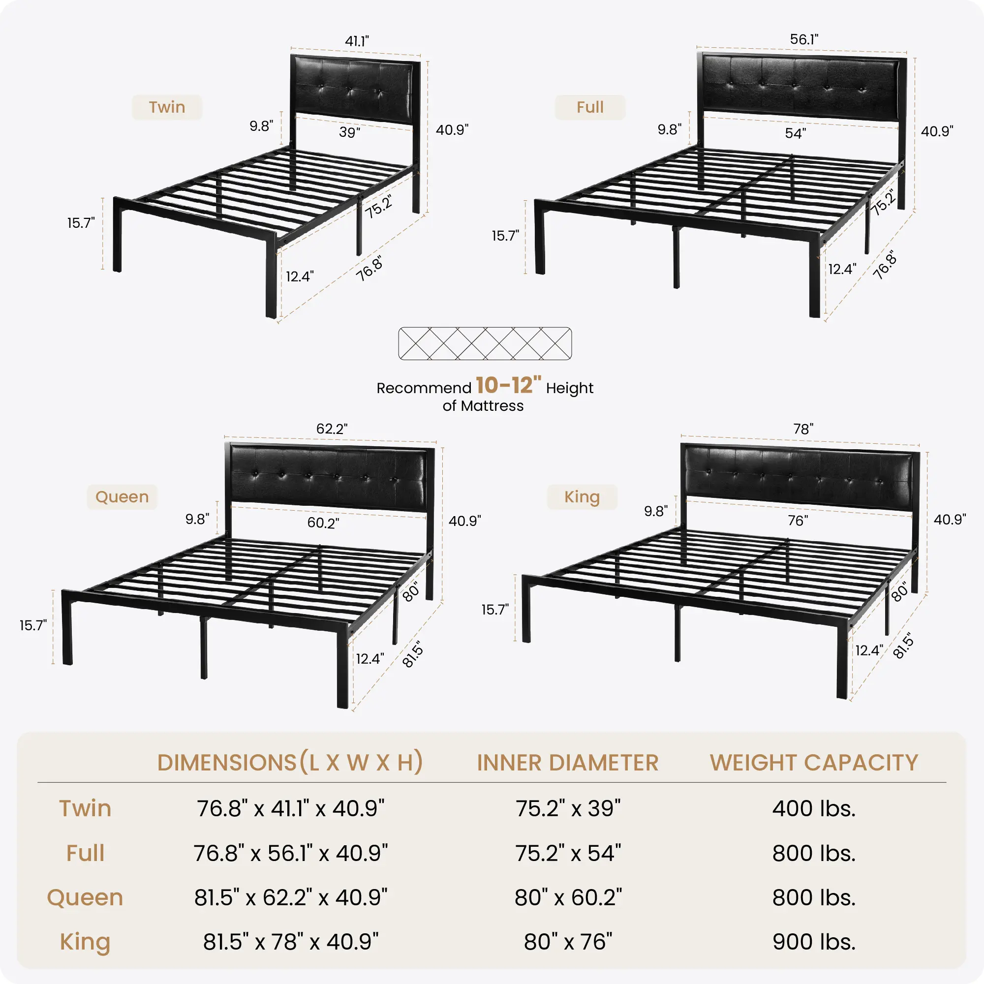 The bed frame comes in 4 sizes and 2 headboard patterns - fabric upholstery and faux leather upholstery. All parts needed like instructions and assembly tools are placed in ONE package.