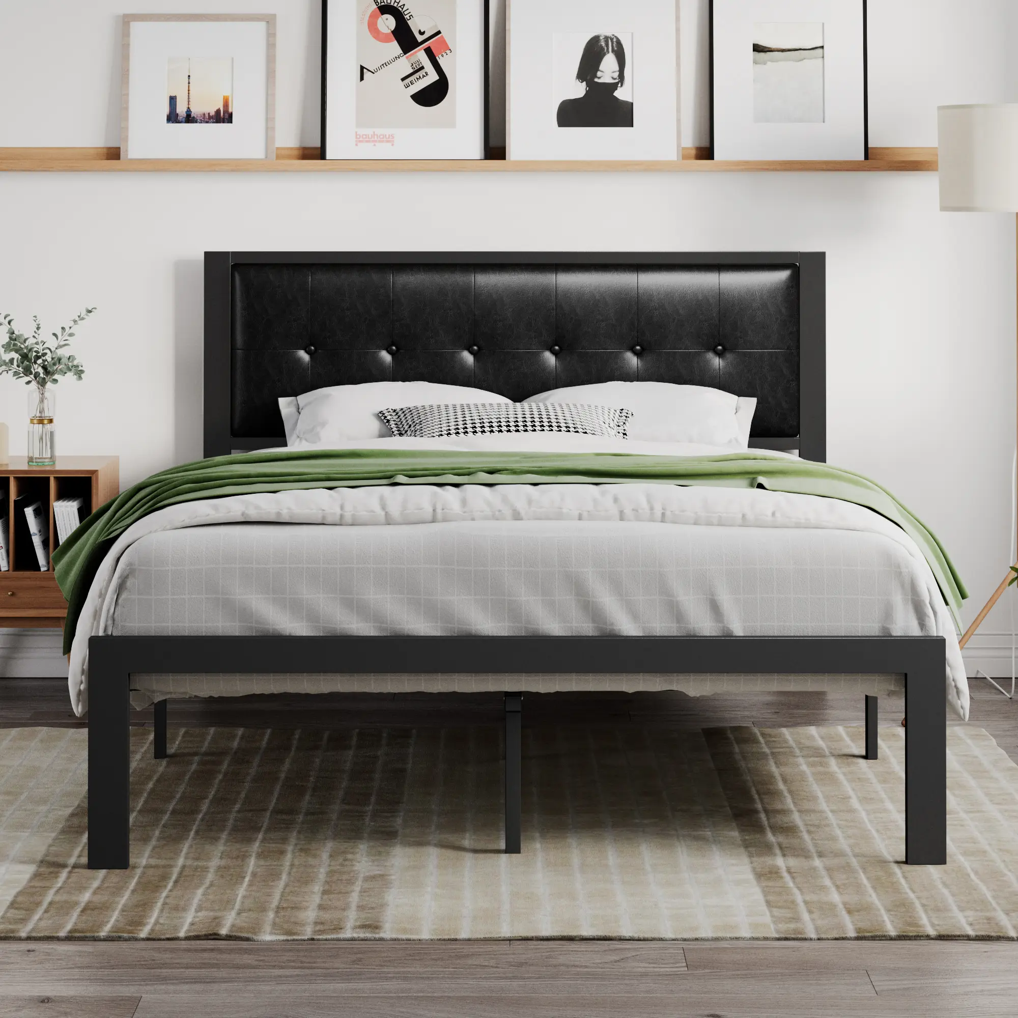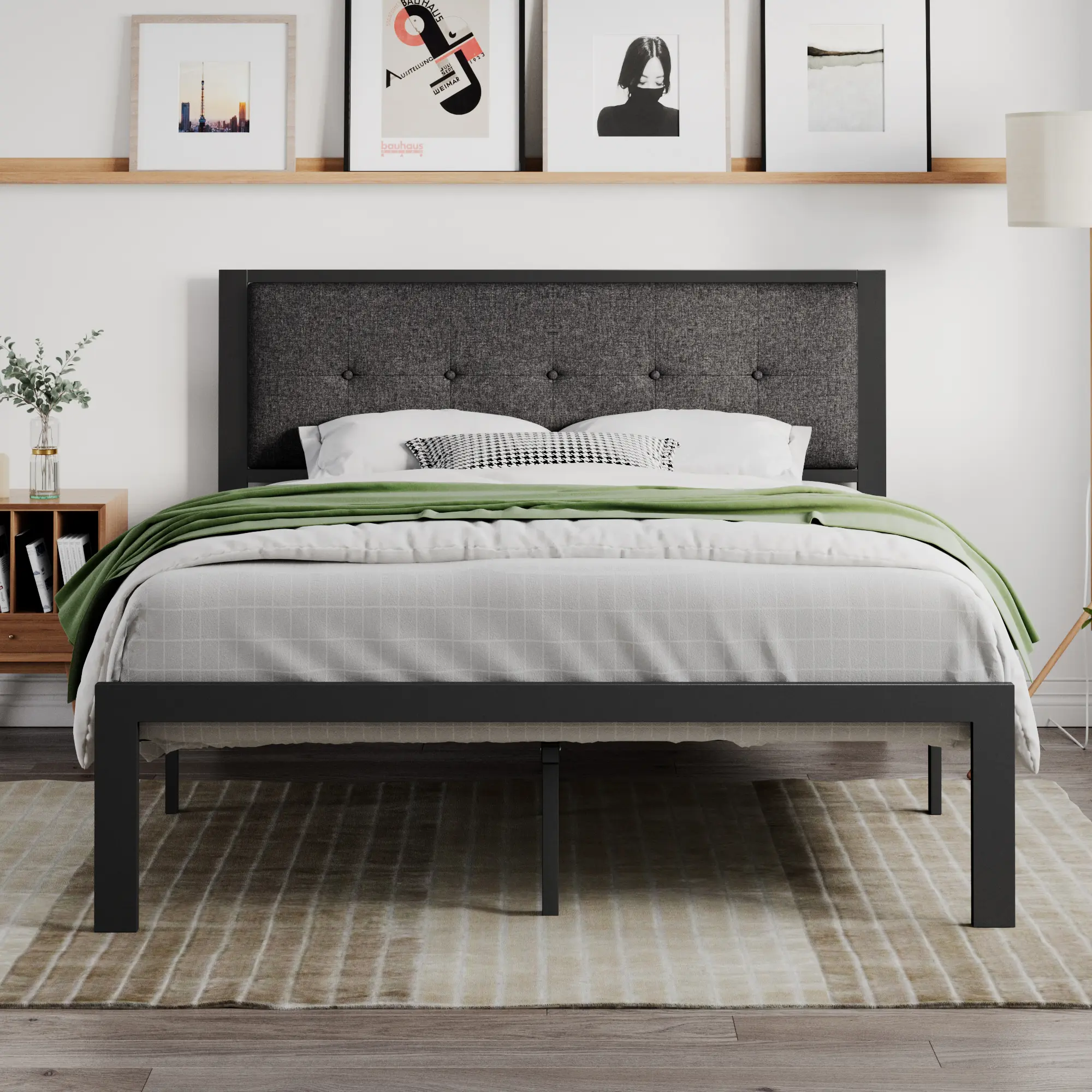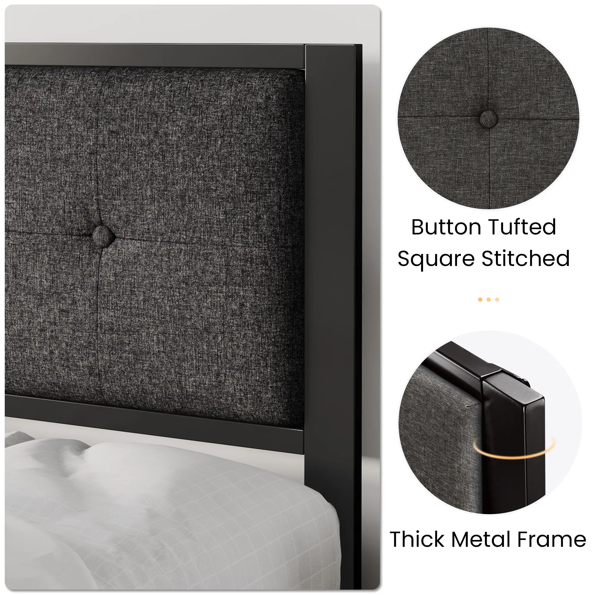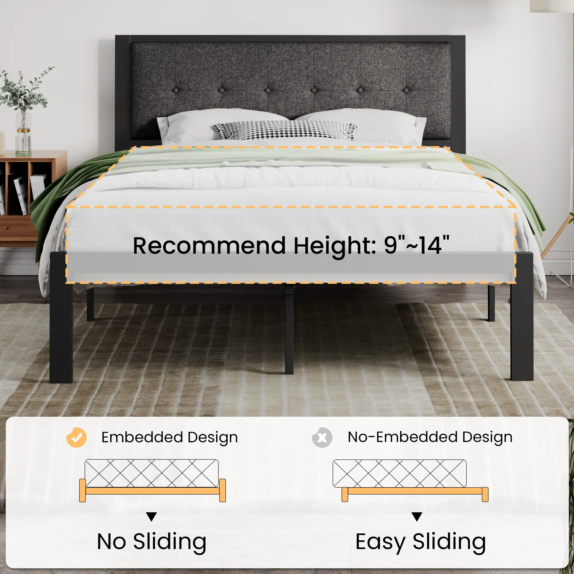 This iron platform bed frame with headboard is very selective and suitable for rooms of any style. The headboard is made of odor-free woven fabric for comfort and safety, or made of faux leather for stylish and easy-cleaning. Button designs are rare on minimalist bed frames, which decorate your room perfectly. Unlike the general bed frame, this bed frame adopts the design of the center rod and upgraded installation process, making the bed frame firm, and reducing noise and shaking.