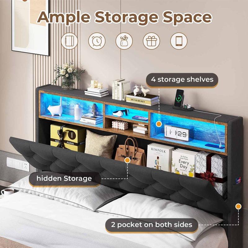 The headboard includes 3-Tier of open storage shelves and 1 big hidden storage making it easy to store items such as mobile phones, tablets, decorations, or some odds. The bed frame's headboard also features a built-in charging station, which includes 2 AC outlets, 1 Type-C(Fast Charger) port & 1 USB(Fast Charger) port.