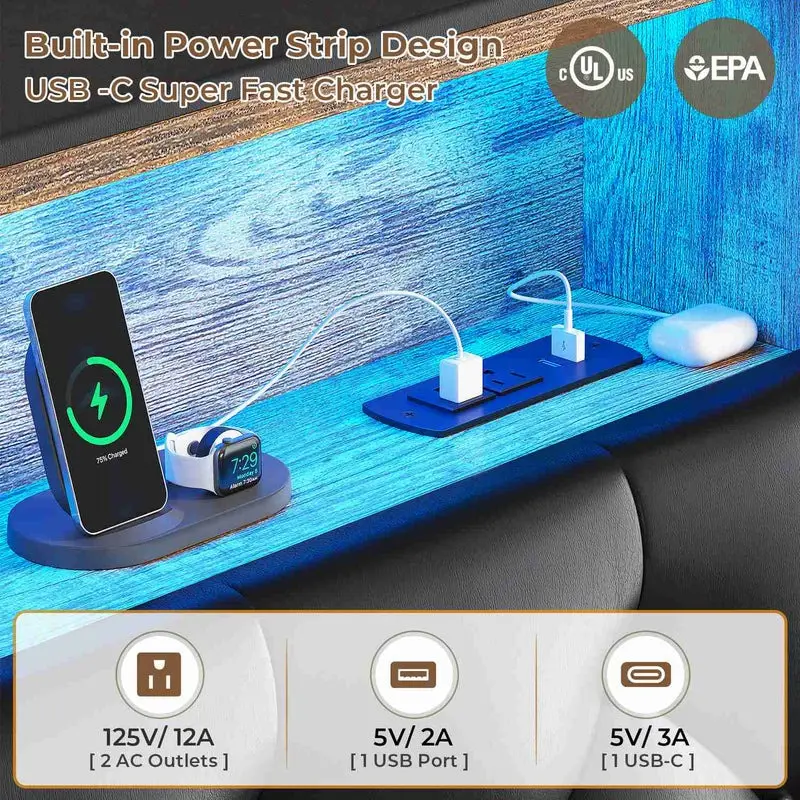 5. Sikaic Upholstered Platform Bed Frame with LED Lights & Charging Station Hidden Storage Headboard and 4 Drawers PU Black