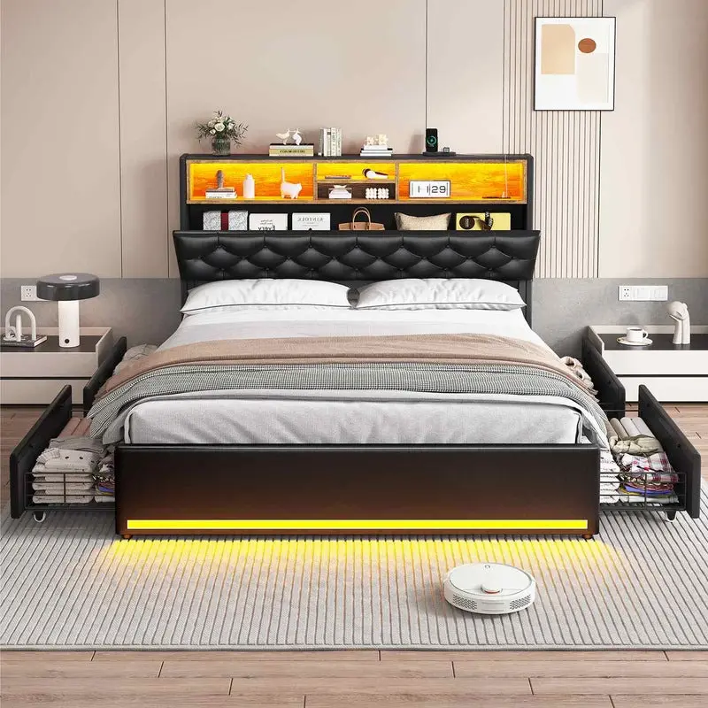 Sikaic Upholstered Platform Bed Frame with LED Lights & Charging Station Hidden Storage Headboard and 4 Drawers PU Black