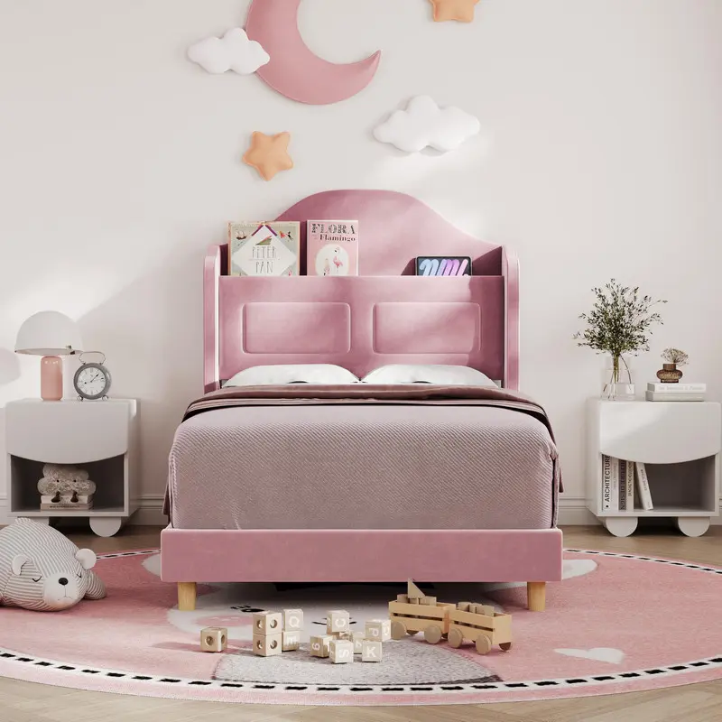 Introducing our Twin Upholstered Bed Frame, the perfect gift for kids that combines elegance and functionality. Crafted from soft velvet fabric, this luxurious bed enhances your child's bedroom decor while providing a cozy surface for a restful night's sleep. Its chic finish complements any style, adding a touch of sophistication to the room.