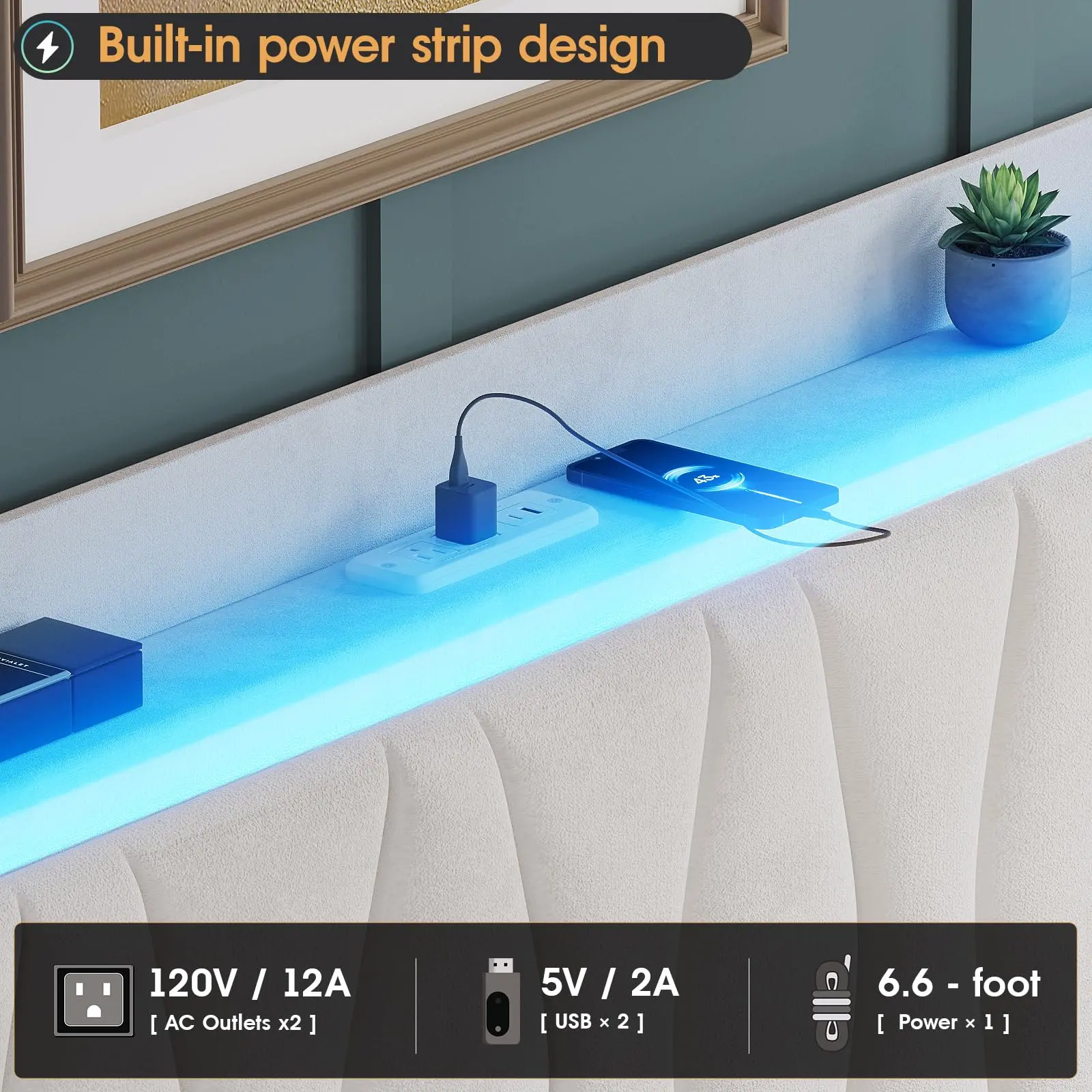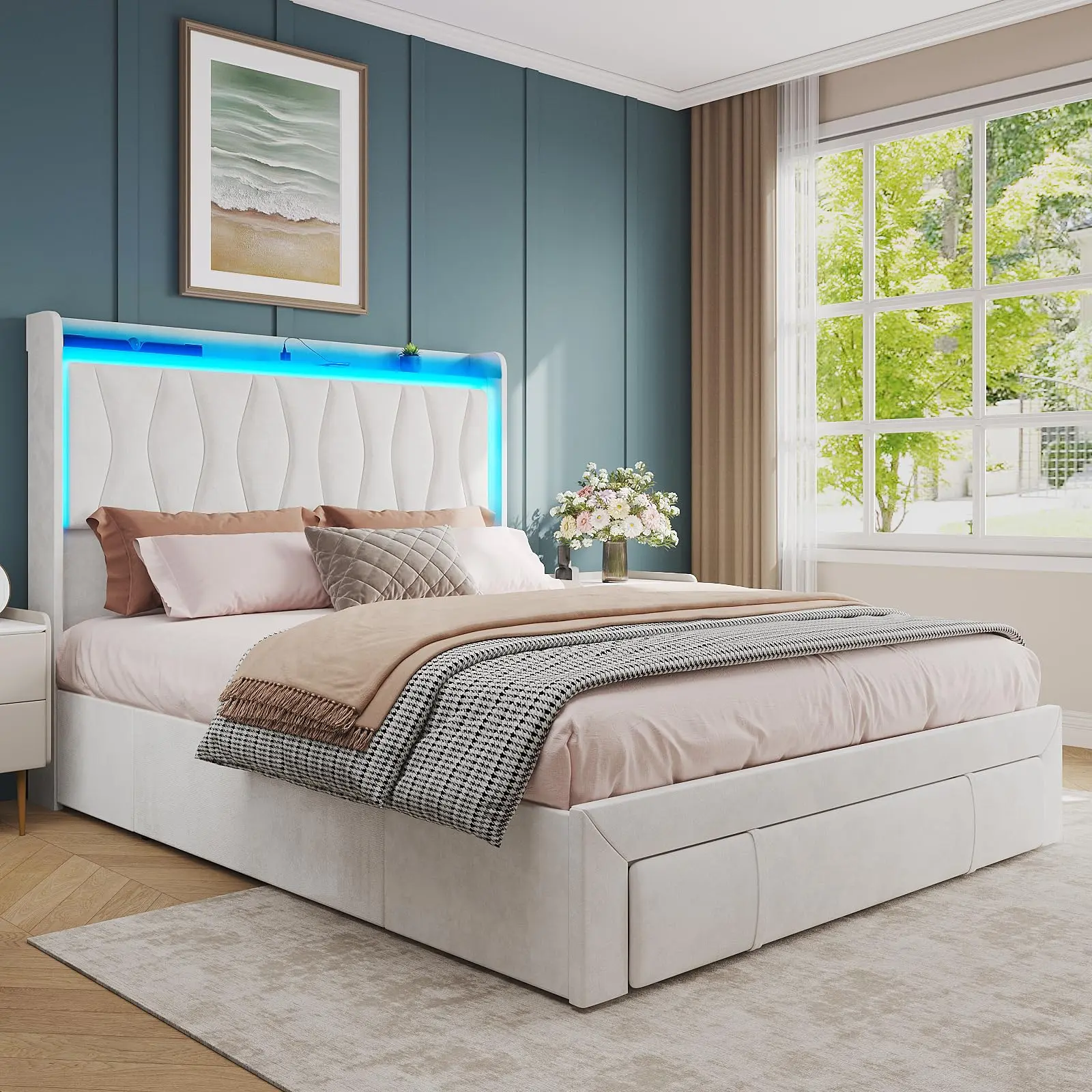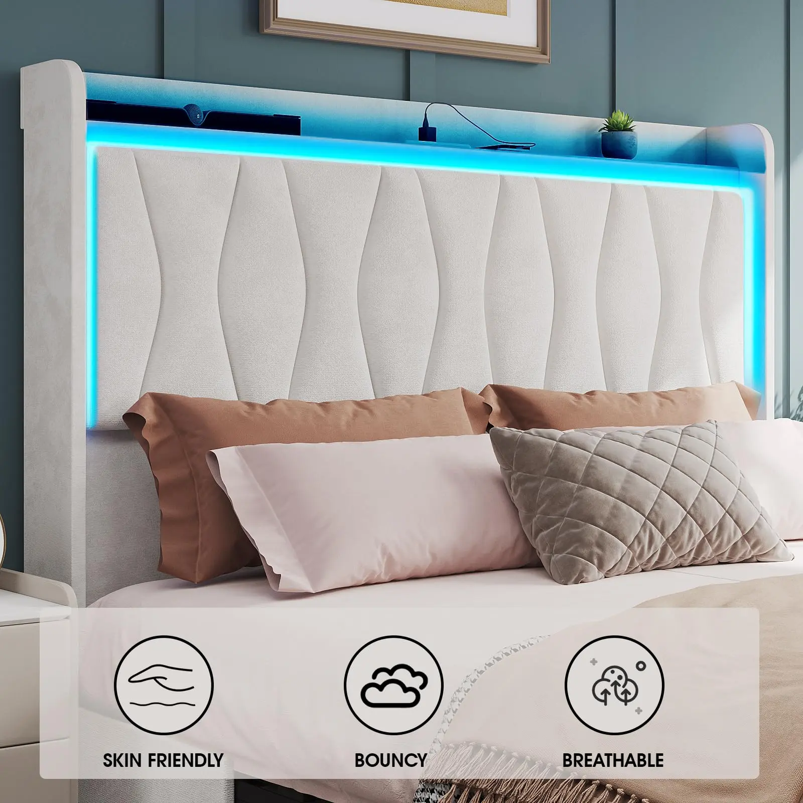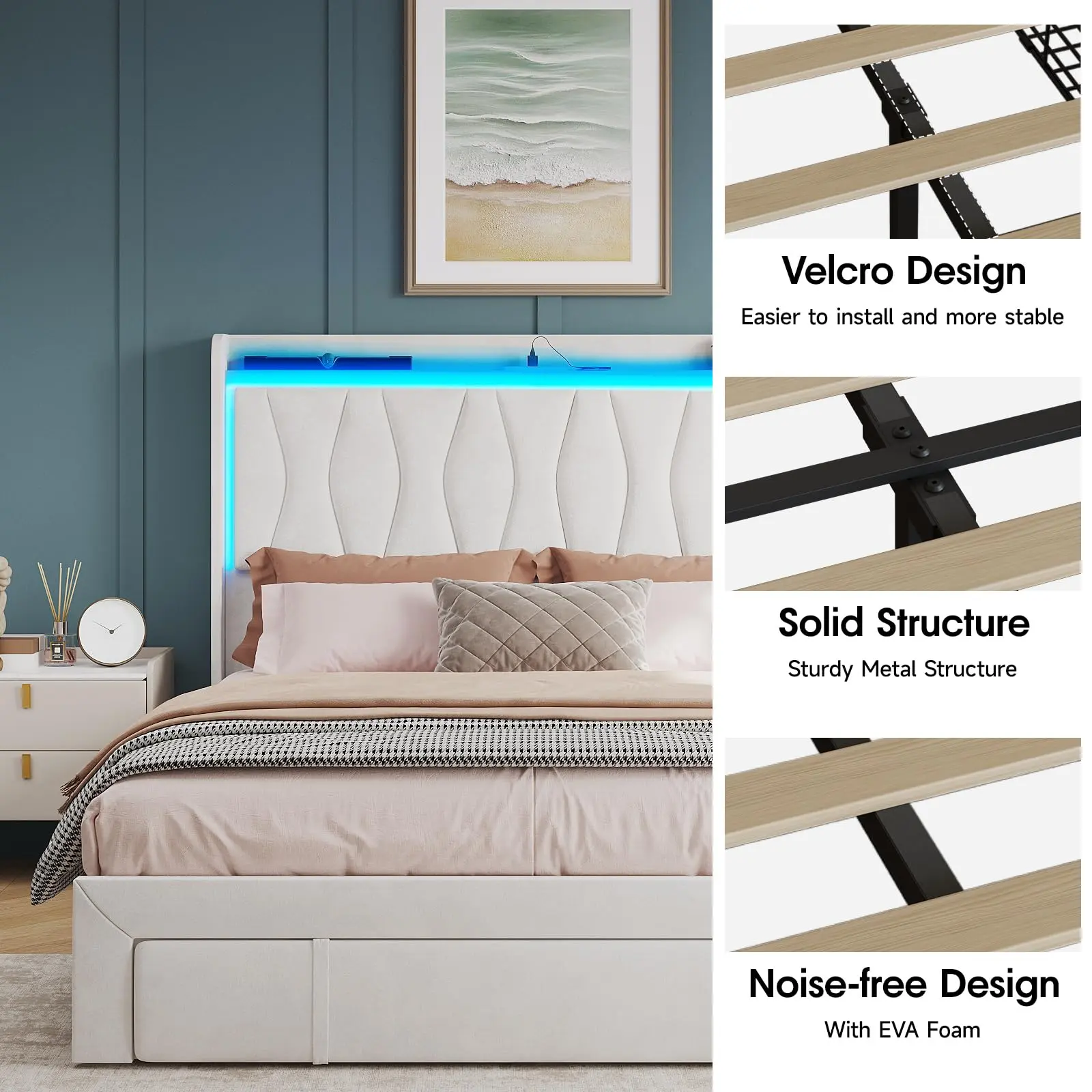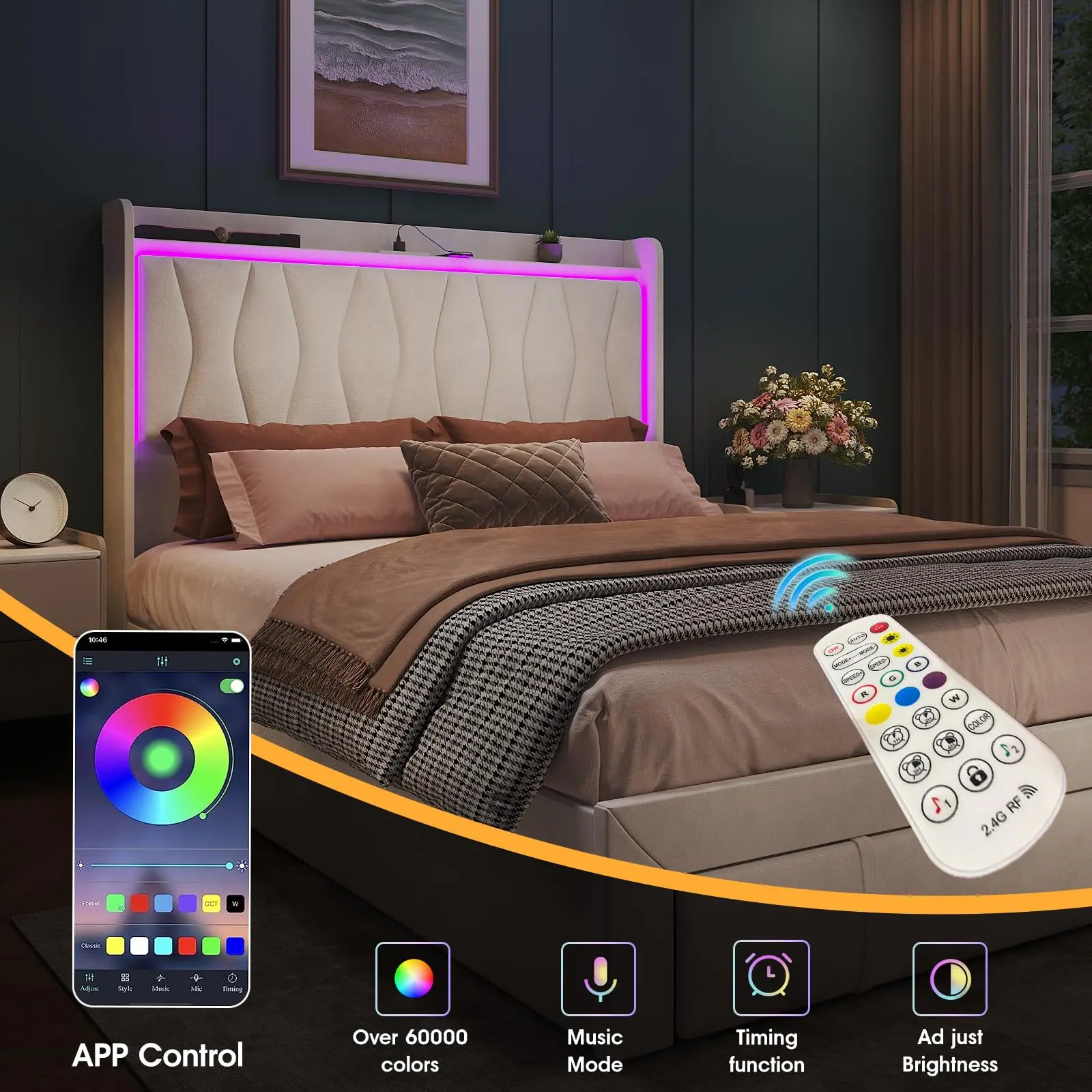 【LED Lights & Built in Charging Station】: This tall headboard bed frame features RGB LED lights on the top of the headboard that can be controlled through an app, making it practical and unique. Bed frame lights can be set using a remote control or application to create a beautiful atmosphere in the bedroom. The charging station at the bedside provides convenient charging for your mobile phone and other electronic products, making your life simpler.