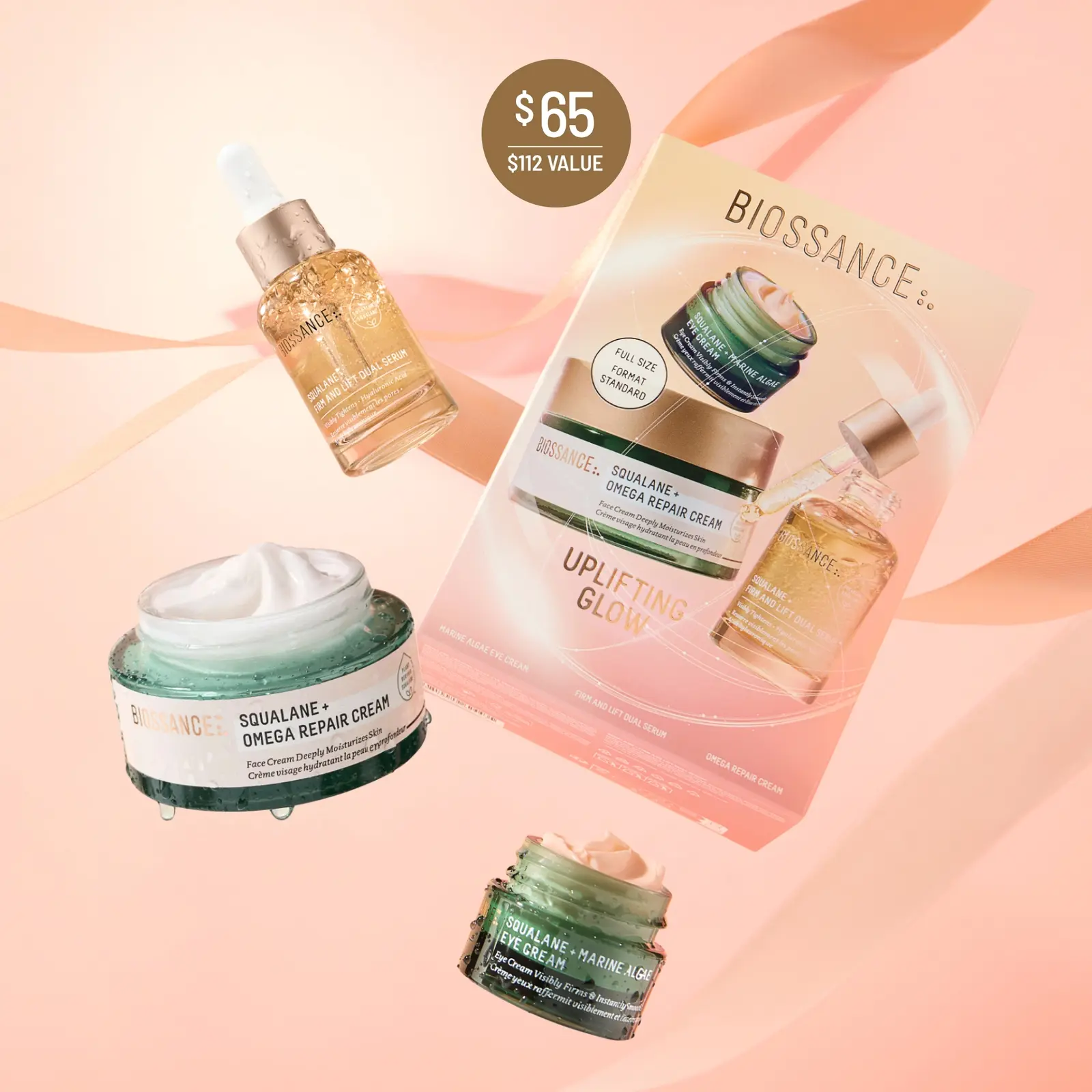 | Ingredients | <p><strong>Omega Repair Cream:</strong> Water/Aqua/Eau, Caprylic/Capric Triglyceride, Squalane, Glycerin, Butyrospermum Parkii (Shea) Butter, Sorbitan Olivate, Cetearyl Olivate, Cetearyl Alcohol, Cetyl Palmitate, Jojoba Esters, Euterpe Oleracea Sterols, Phenoxyethanol, Sorbitan Palmitate, Ceramide Np, Carbomer, Tocopherol, Ethylhexylglycerin, Sodium Hydroxide, Sodium Gluconate, Sodium Hyaluronate, Linoleic Acid, Oleic Acid, Linolenic Acid.</p><p><strong>Firm & Lift Dual Serum:</strong> Water/Aqua/Eau, Squalane*; Glycerin, Sodium Benzoate, Sodium Hyaluronate, Ectoin, Potassium Sorbate, Phenoxyethanol, Bisabolol Propanediol, Citric Acid, Sodium Gluconate, Leucojum Aestivum Bulb Extract, Acmella Oleracea Extract, Hippophae Rhamnoides Fruit Oil, Melia Azadirachta Extract, Moringa Oleifera Seed Oil. *Sugarcane-Derived Squalane</p><p><strong>Marine Algae Eye Cream: </strong>Water (Aqua), Caprylic/Capric Triglyceride, Squalane, Glycerin, Sorbitan Olivate, Cetearyl Olivate, Jojoba Esters, Glyceryl Stearate SE, Panthenol, Hydroxyethyl Acrylate/Sodium Acryloyldimethyl Taurate Copolymer, Cetyl Palmitate, Spilanthes Acmella Flower Extract, Palmitoyl Tripeptide-5, Sorbitan Palmitate, Dunaliella Salina Extract, Astaxanthin, Sodium Hyaluronate, Phenoxyethanol, Ethylhexylglycerin, Tocopherol, Citric Acid.</p><p class="border border-black p-4"><em><strong>For the latest information, it is recommended to review the ingredient list printed on the packaging of the product prior to usage or consumption.</strong></em></p> |