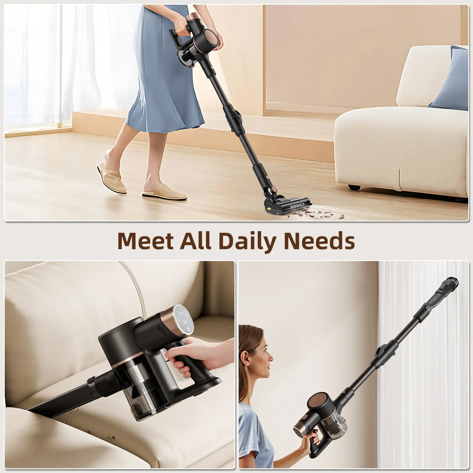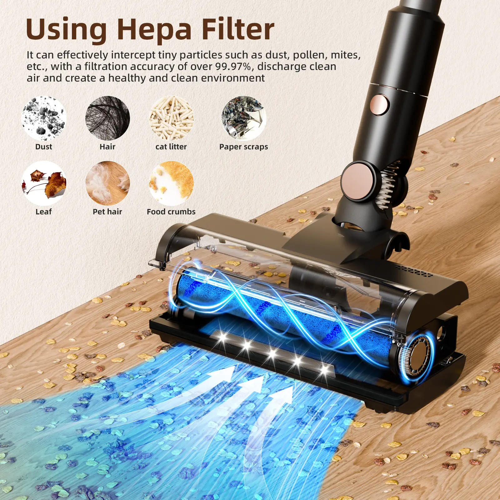 ·FLEXIBLE ROTATING LED LIGHT FLOOR BRUSH: The 180° rotating head allows you to easily clean under furniture, along edges and in hard-to-reach corners such as sofas, beds and tables. The built-in LED lights on the floor brush illuminate dust, debris and pet hair in dark corners and under furniture to ensure a thorough clean. Great for pet owners and busy families, you can also keep your home spotless!