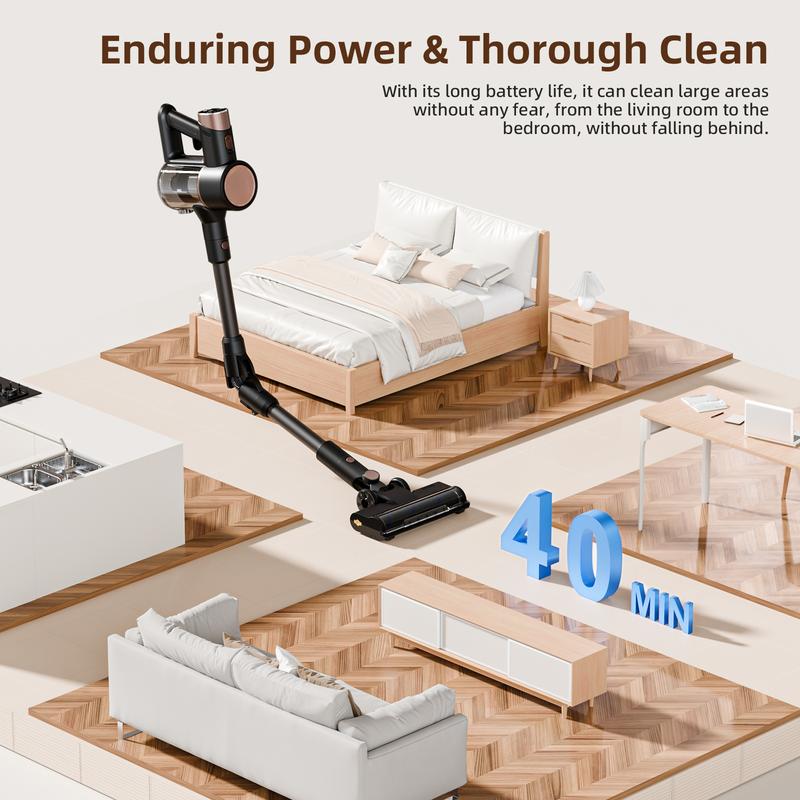 ·ADJUSTABLE SUCTION POWER: This lightweight cordless vacuum features two speed settings, giving you the flexibility to tackle pet hair, fine dust, debris on a variety of floor types including hardwood, tile, marble, laminate, carpet. Easily switch between High mode (10kPa for 16 minutes) and Standard mode (5kPa for 40 minutes).