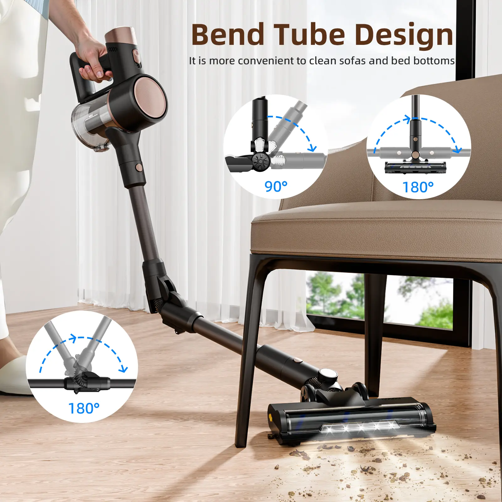 ·ROTATABLE BEND DESIGN: Easily maneuver the vacuum cleaner in and out of small spaces, corners, under sofas, under beds, around furniture, etc. for deep cleaning.