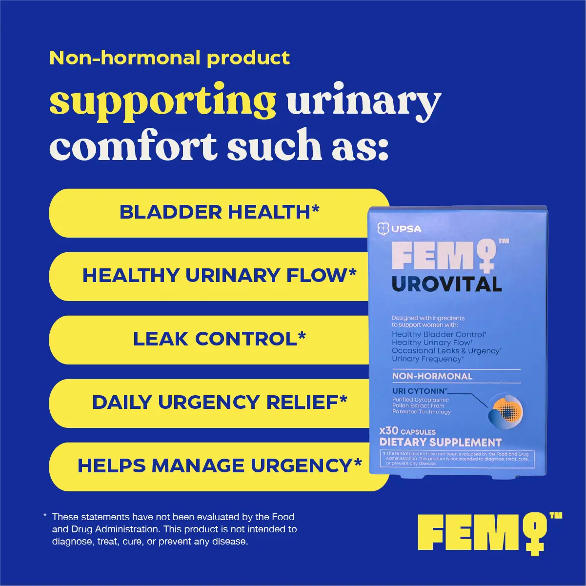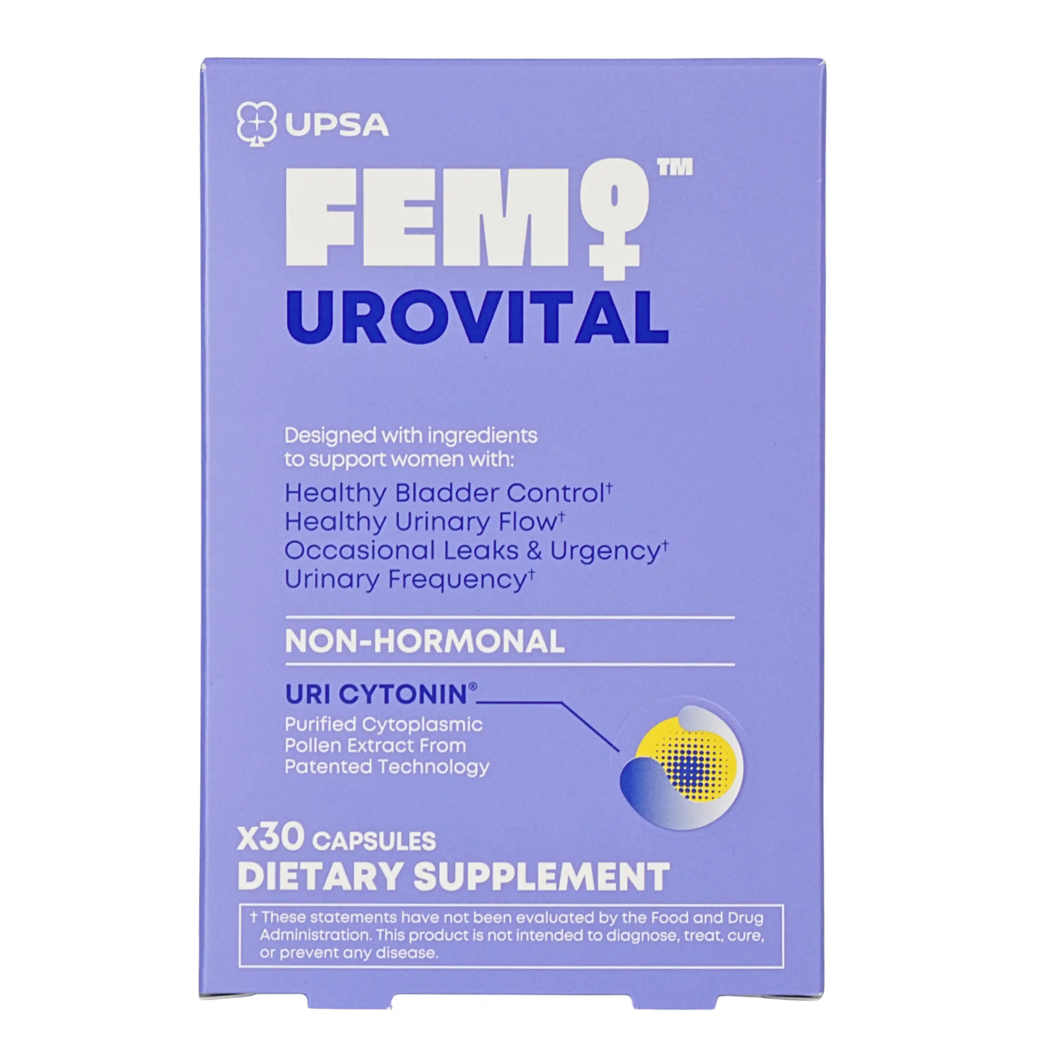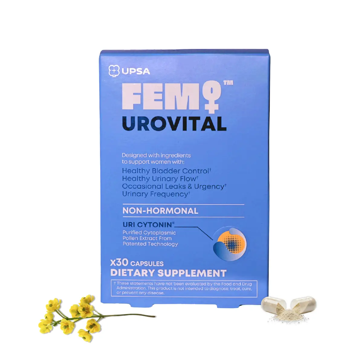 Formulated with UriCyTonin, a patented purified cytoplasmic pollen extract, combined with pumpkin seed extract, FEM UROVITAL provides daily support without hormones or estrogen. This non-hormonal formula is developed to support healthy bladder function and urinary comfort as part of a balanced wellness routine.