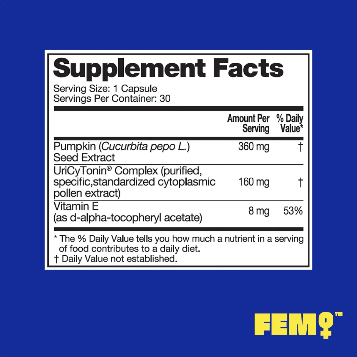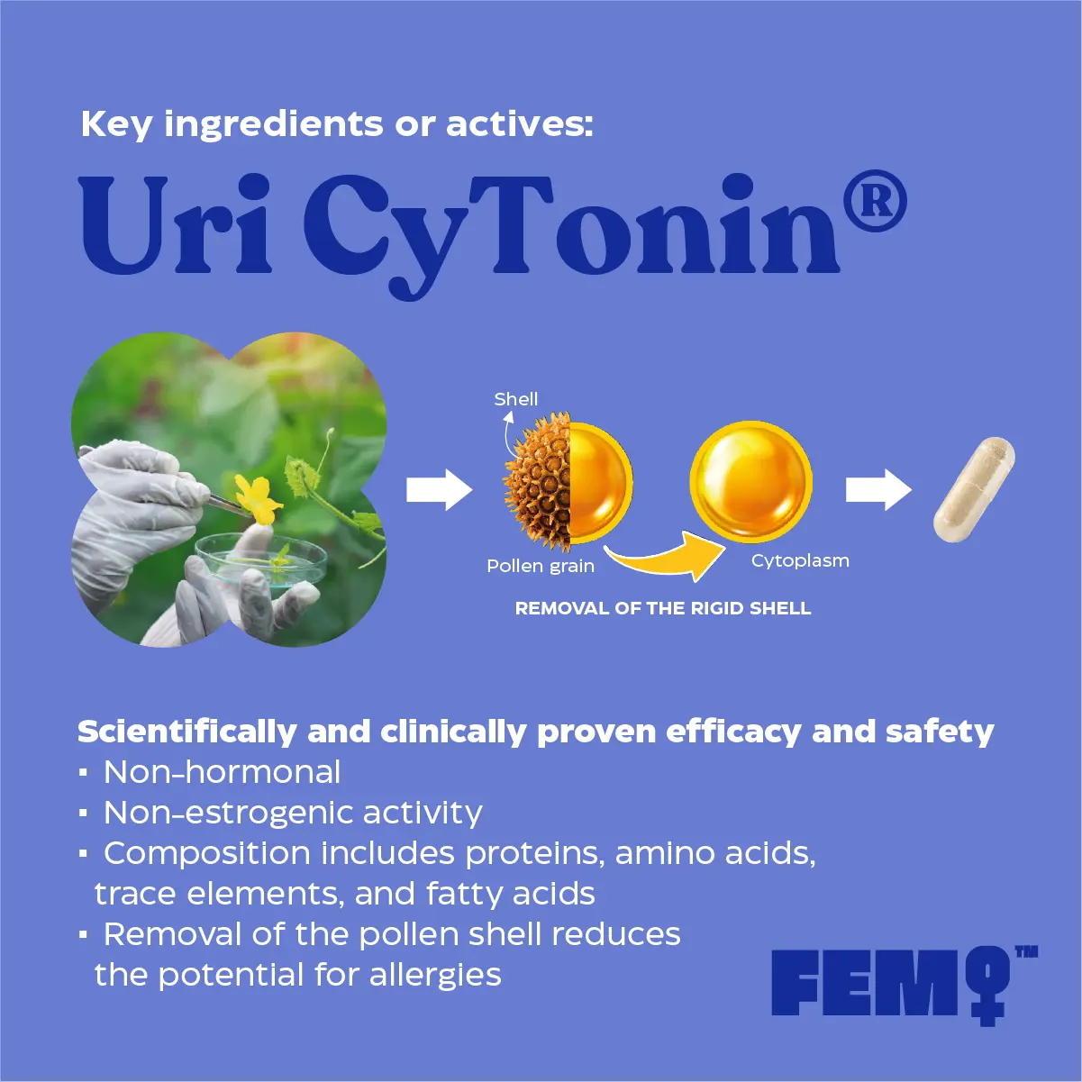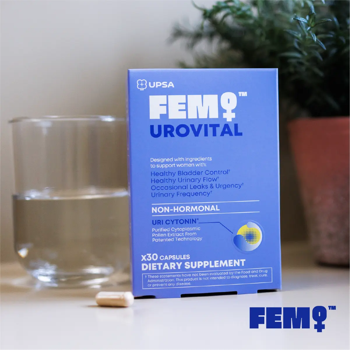 Formulated with UriCyTonin, a patented purified cytoplasmic pollen extract, combined with pumpkin seed extract, FEM UROVITAL provides daily support without hormones or estrogen. This non-hormonal formula is developed to support healthy bladder function and urinary comfort as part of a balanced wellness routine.