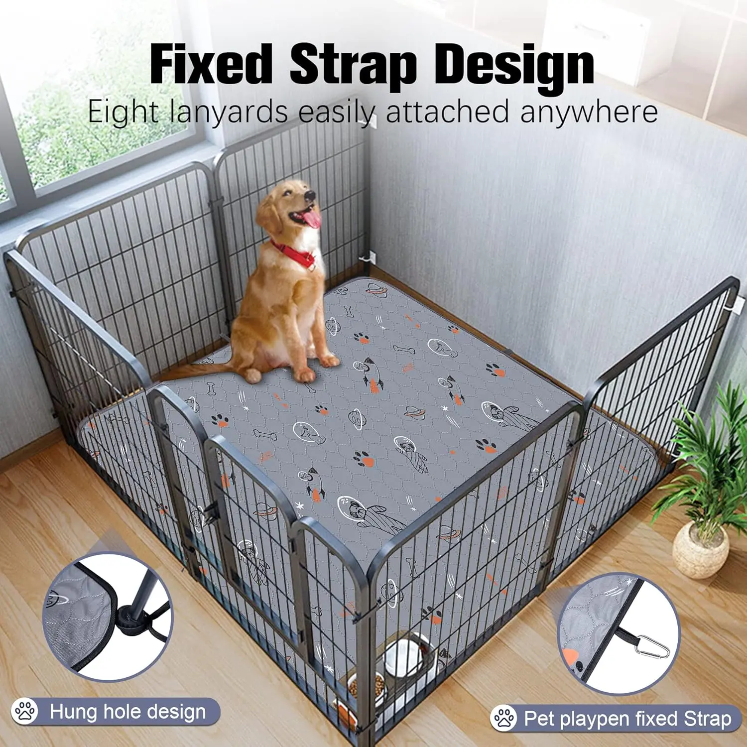 ·Fixed Strap Design: The additional design of the washable dog pee pads adds eight straps that can be attached anywhere, especially inside a pen or cage. Not only provide dual non-slip, can hold the mat in place and prevent pets from pulling. The periphery of a wrapped edge prevents urine outflow and is more anti-tear. Take full care of your pets and your home.