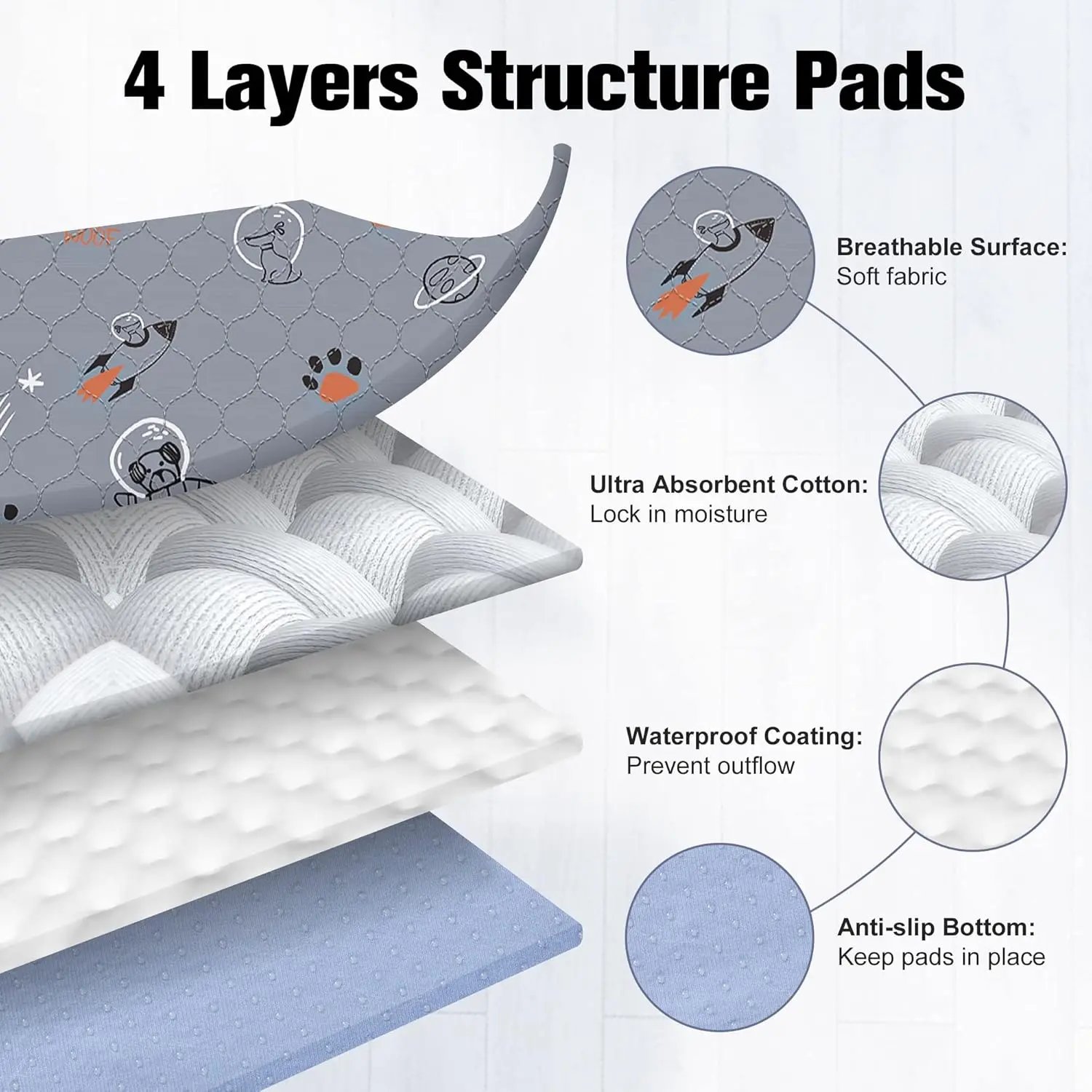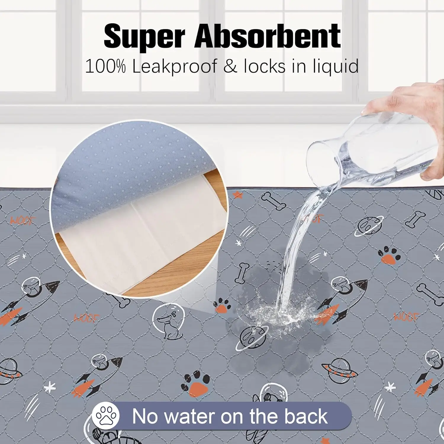 ·Super Absorbent: Adopt 4 layers structure, thickened fabric inner can quickly absorb pet urine, and the high-quality waterproof material TPU layer effectively locks in the liquid. Prevent leaks and odor left, keeping your floor clean and dry and creating a comfortable environment for your dogs.