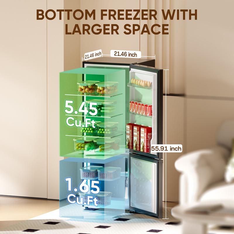 ✨ Upstreman Mini Fridge 7.1 Cu.Ft Energy-efficient Bottom Freezer Refrigerator with Adjustable Thermostat & Double Door Design for Apartment Kitchen Dorm BM71. This fridge offers a 7.1 Cu.Ft capacity, split into 5.45 Cu.Ft fridge and 1.65 Cu.Ft freezer. Its space-saving size measures 21.46"W x 21.46"D x 55.91"H. No bending is required for fridge access, and the waist-high freezer reduces strain.