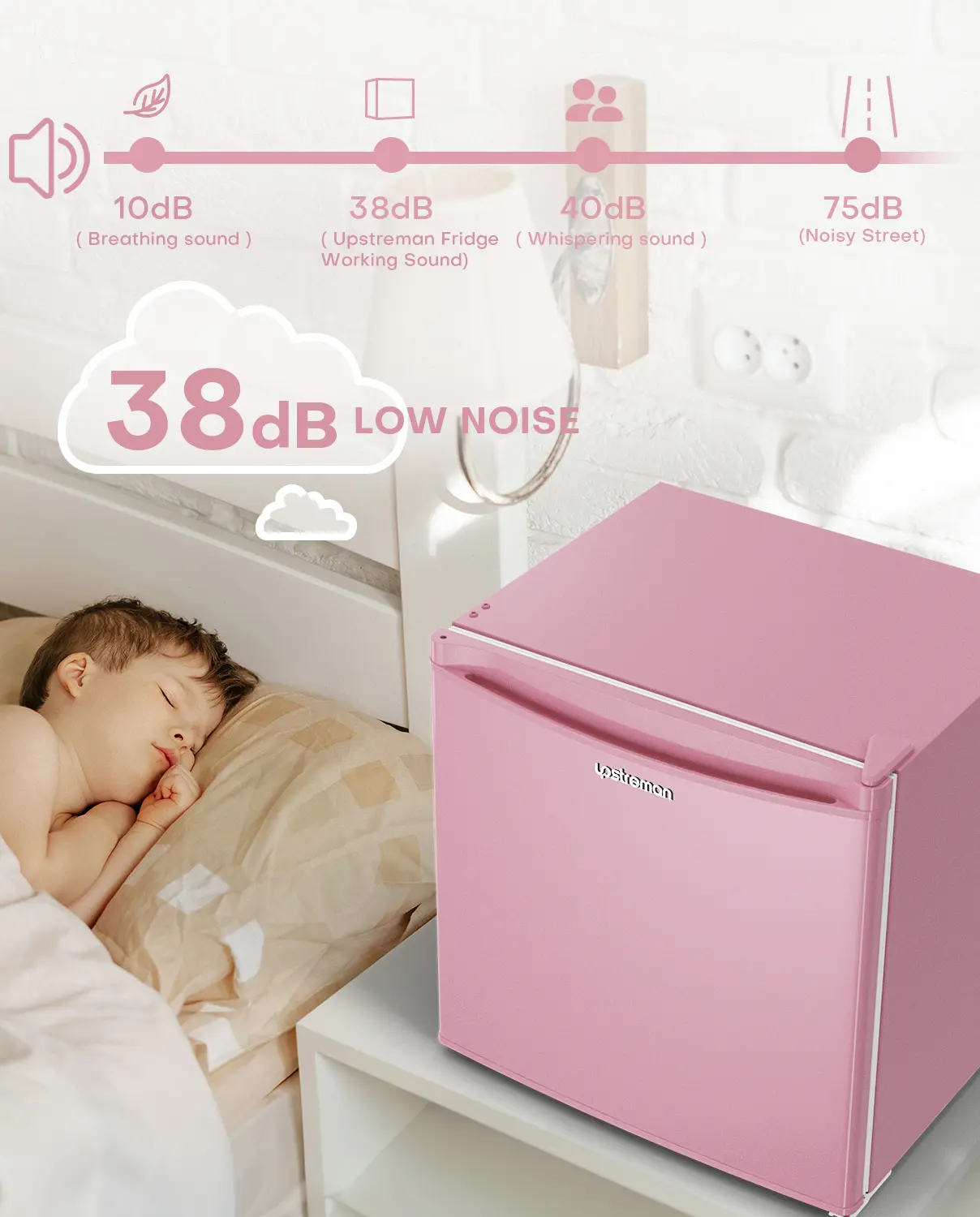 ⨠The Upstreman 1.7 Cu.ft Mini Fridge in Pink is perfect for dorms, offices, or bedrooms. It measures 18.9ā x 17.7ā x 19.3ā (WxDxH), fitting counters and desks. This single-door fridge offers 5 temperature settings (33.8°Fā46.4°F) and a compact freezer for ice cubes. It operates ultra-quietly at 38dB, ideal for quiet environments.