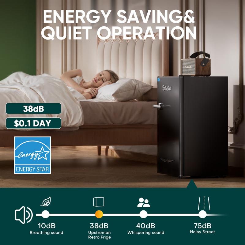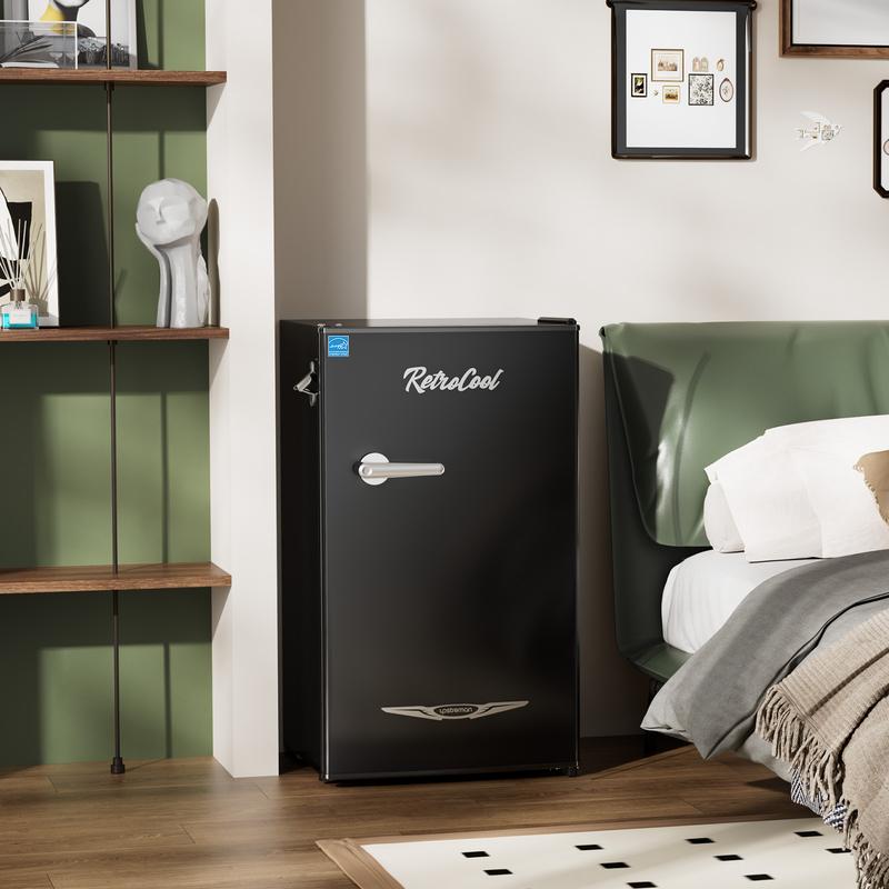 ✨ This mini fridge boasts a classic exterior with a metal handle and a side bottle opener. It adds vintage charm to any home decor. The compact size (18.7"x17.4"x33.07", 3.2 cu.ft) makes it ideal for small spaces like bedrooms or offices. 🌟
