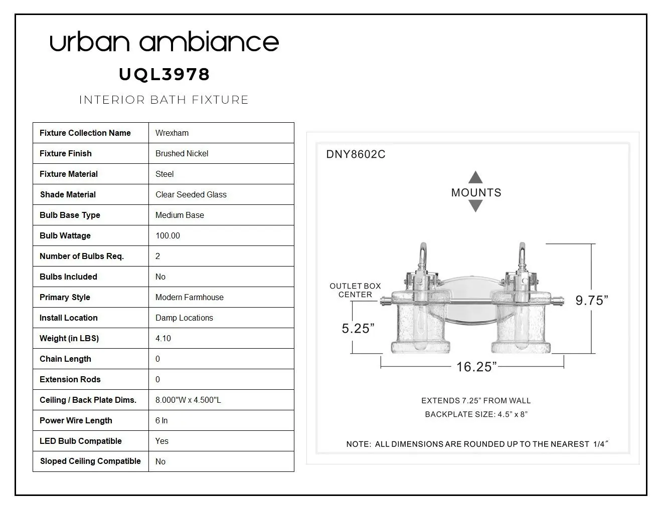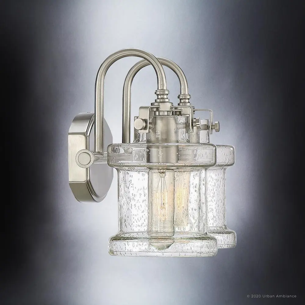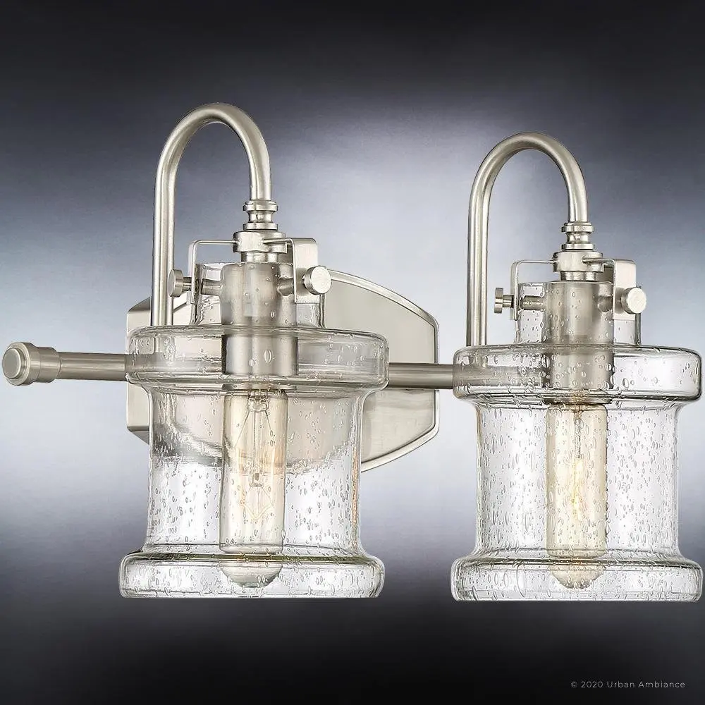 The UQL3978 transforms morning routines into moments of clarity, where seedy glass jar shades cast a warmer, more inviting glow than the harsh fluorescents common in budget bath fixtures. Its substantial steel construction and hand-finished brushed nickel outlast the thin, stamped alternatives that tarnish within months. Urban Ambiance's reversible design adapts gracefully between modern farmhouse and traditional spaces, while competitors remain stylistically rigid—all backed by the UA Guarantee's unmatched service commitment.