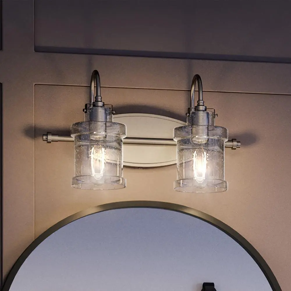 The UQL3978 creates a striking difference through its jar-inspired silhouette paired with seedy glass that adds depth and visual texture, unlike the flat or plain shades often seen in similar bath fixtures. Its brushed nickel finish offers a versatile look that bridges traditional and modern settings, while the detailed metal trim elevates the craftsmanship. The seeded glass diffuses light with a warm, charming glow, making the illumination both functional and atmospheric.
