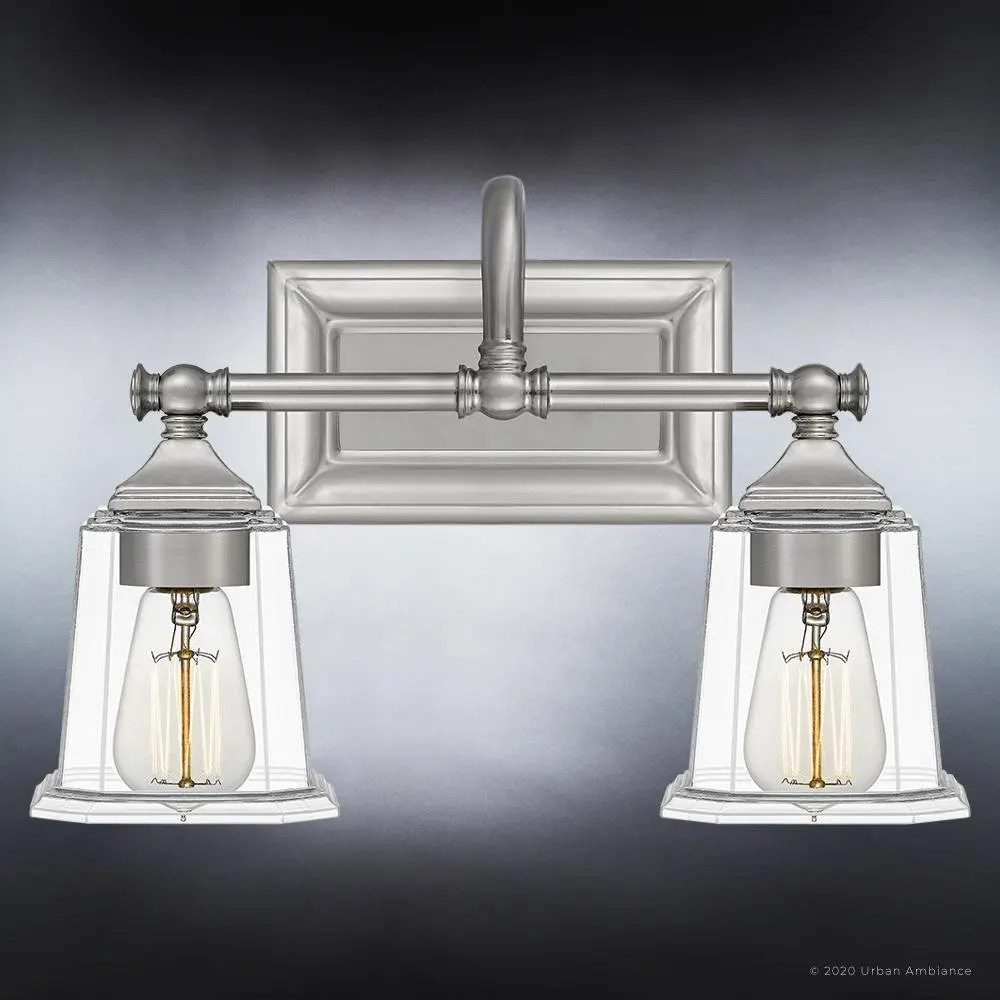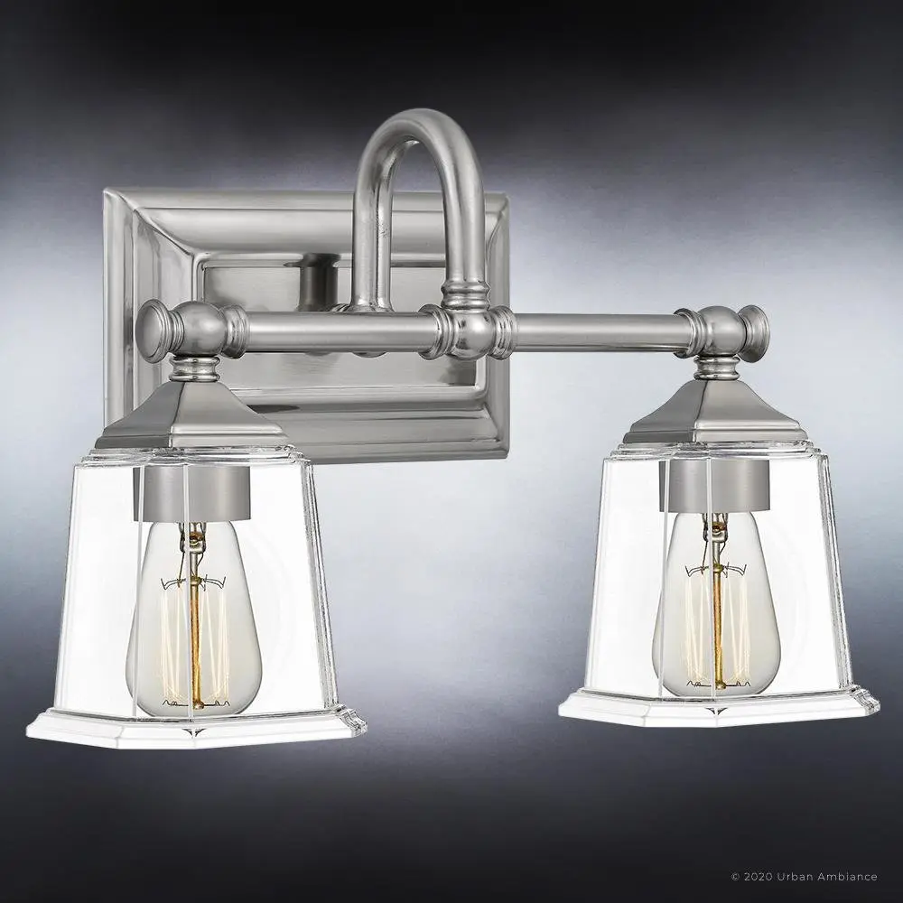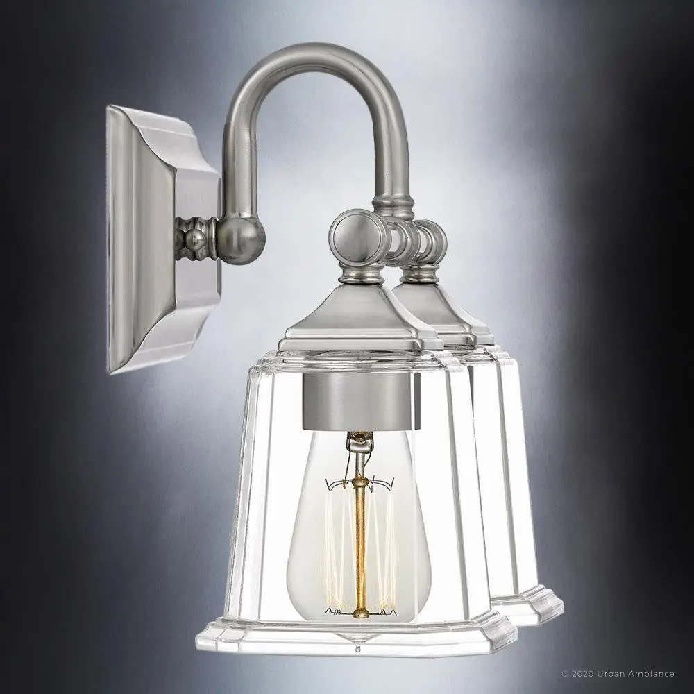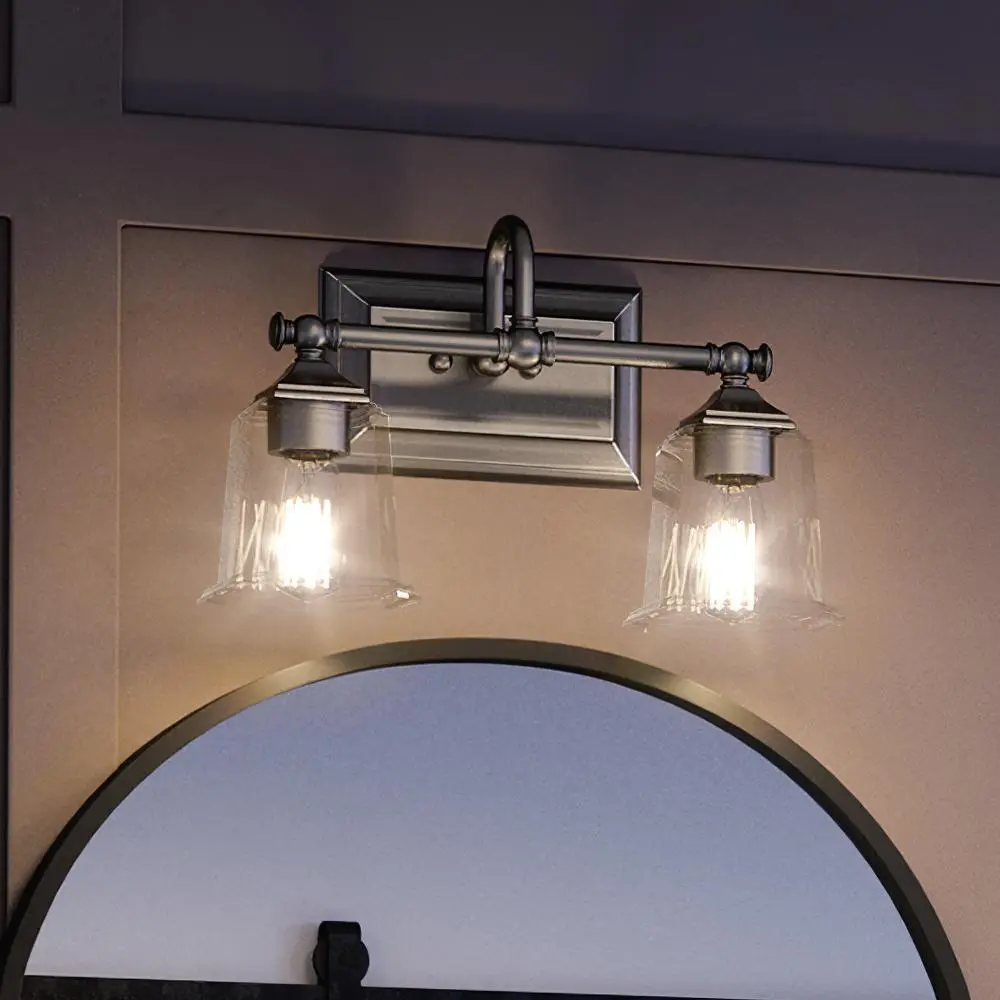 The Edinburgh UQL4115 upgrades morning routines into moments of self-care, its midcentury gooseneck arms and stepped glass shades casting warmer, more flattering light than typical builder-grade vanity bars. While competitors rely on thin stamped metal that wobbles during cleaning, this fixture's substantial steel construction and 3.8-pound heft promise decades of unwavering elegance. The reversible design adapts gracefully to any bathroom renovation, backed by Urban Ambiance's trusted UA Guarantee.