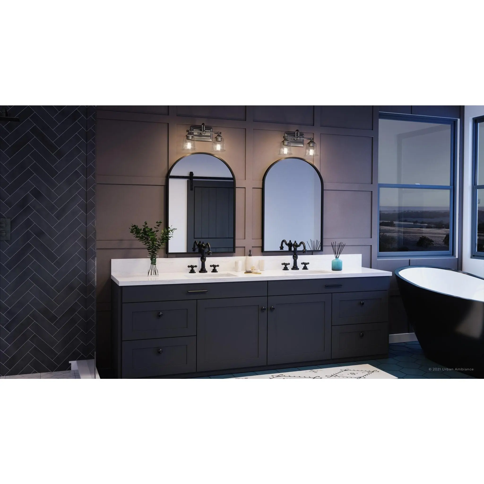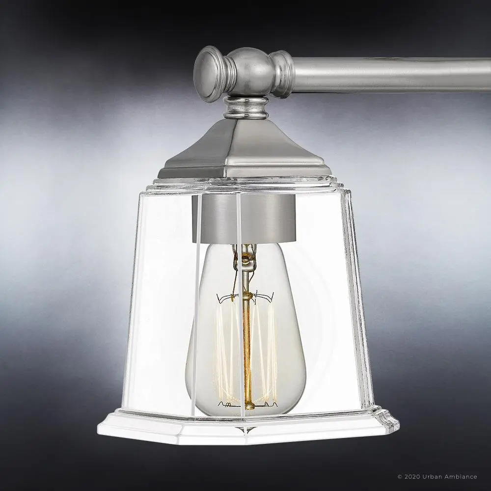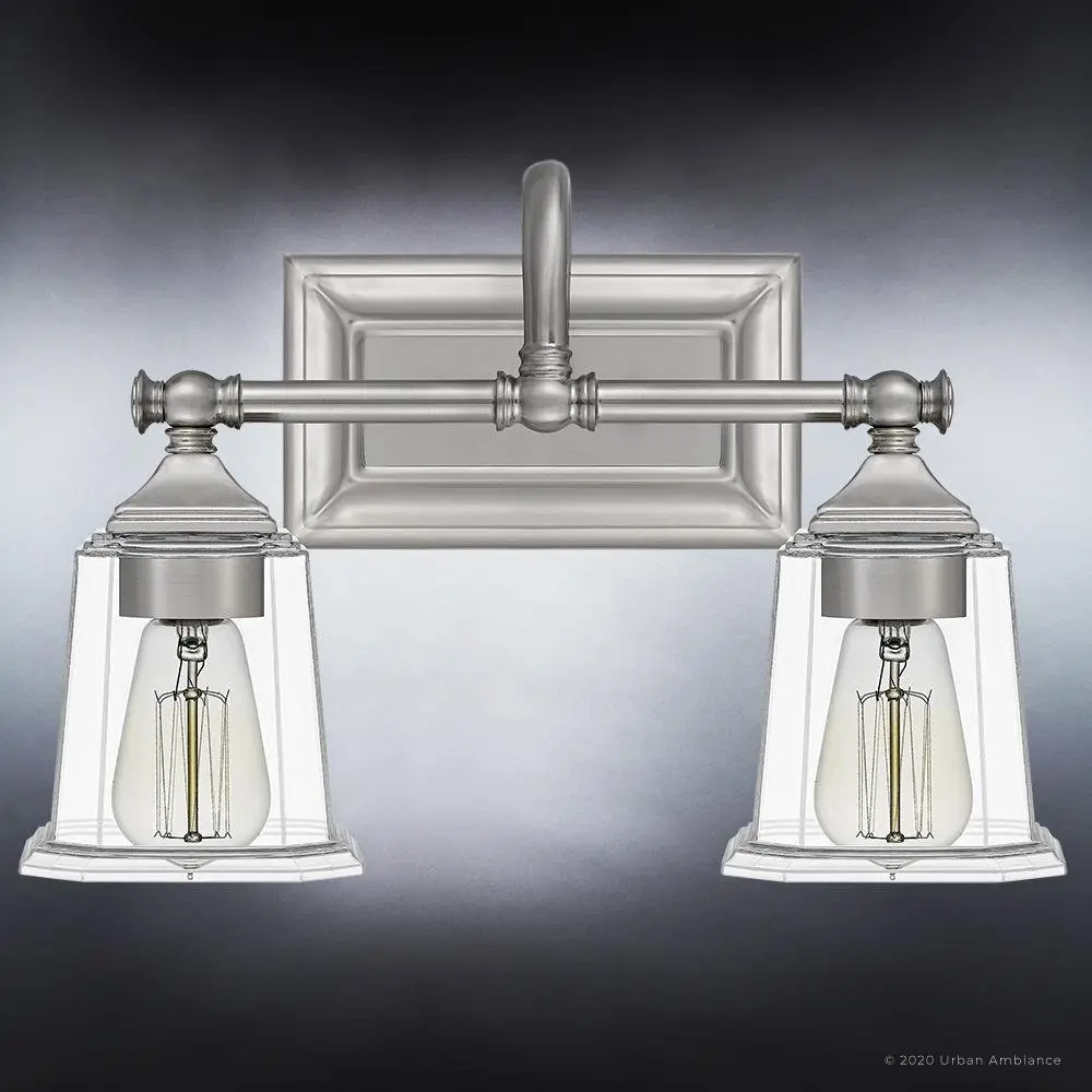 The Edinburgh UQL4115 upgrades morning routines into moments of self-care, its midcentury gooseneck arms and stepped glass shades casting warmer, more flattering light than typical builder-grade vanity bars. While competitors rely on thin stamped metal that wobbles during cleaning, this fixture's substantial steel construction and 3.8-pound heft promise decades of unwavering elegance. The reversible design adapts gracefully to any bathroom renovation, backed by Urban Ambiance's trusted UA Guarantee.