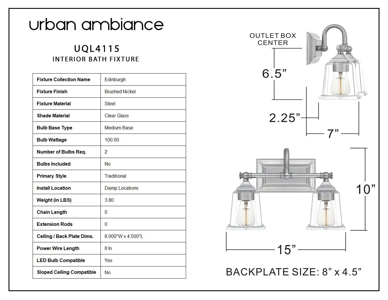 ·CEILING OR WALL PLATE DIMS: 8"W x 4.5"L