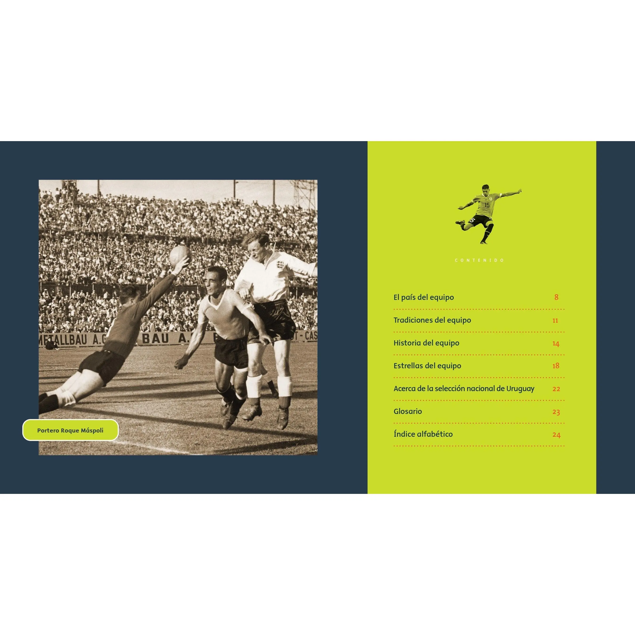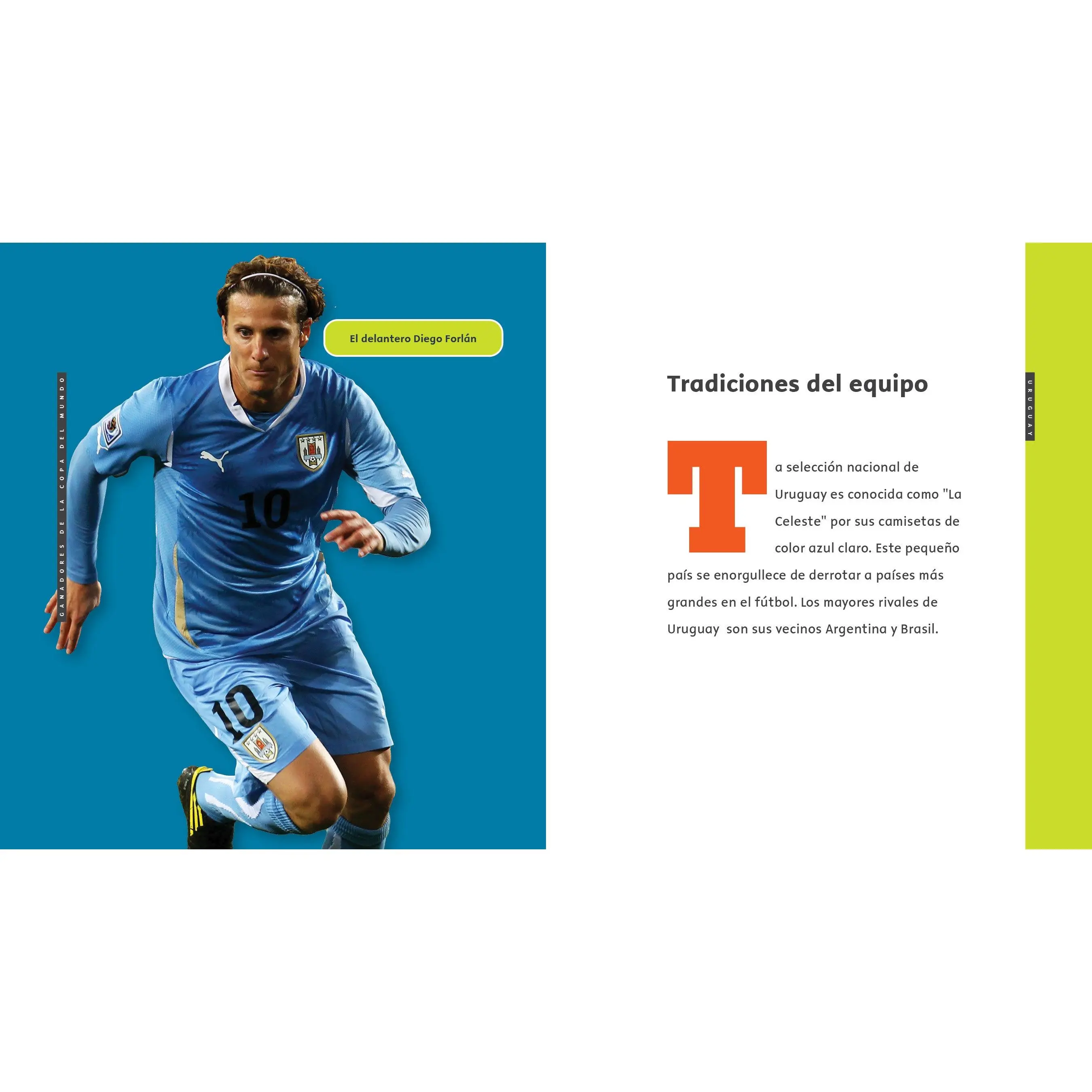 The first FIFA World Cup winner was not a soccer powerhouse like Brazil or Germany. Tiny Uruguay not only defeated its mighty neighbor Argentina to win the first trophy in 1930, but the country also won every match it played in that tournament! “La Celeste” also won the World Cup 20 years later in a final against Brazil. This elementary-level title, translated into North American Spanish, follows the thrilling matches of Uruguay’s golden era, sharing Luis Suárez and Federico Valverde’s hopes for future glory. Vibrant layouts spotlight players of different eras, and an “About the Team” section recaps important facts. Includes a glossary and index.