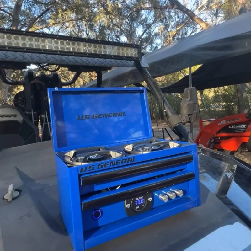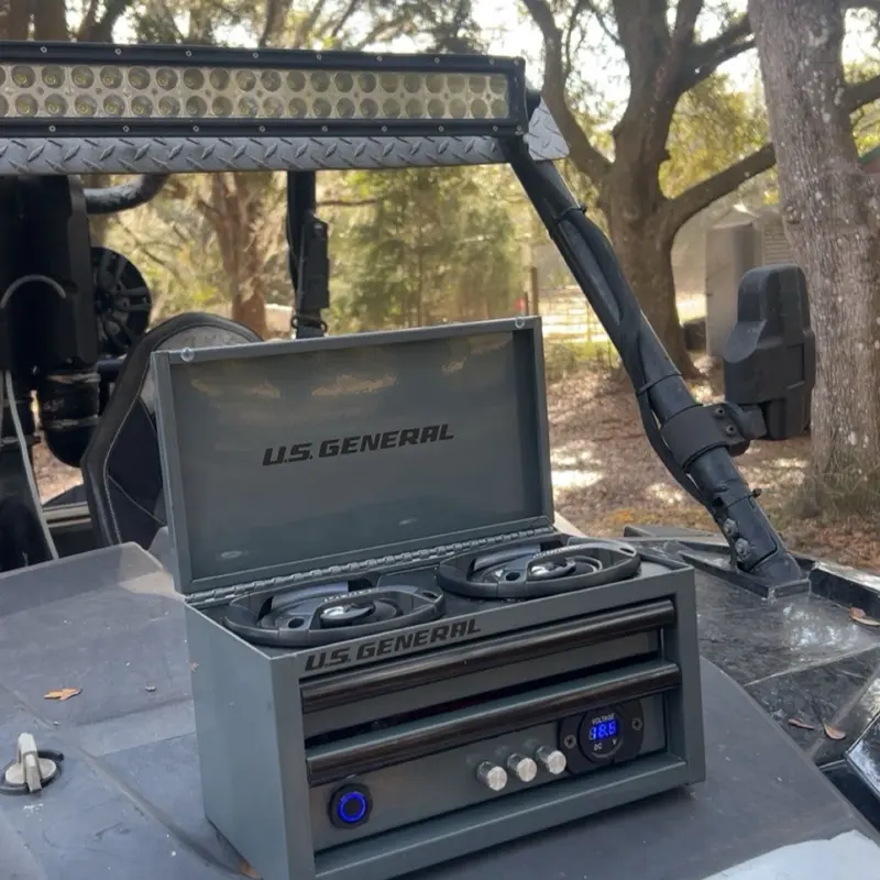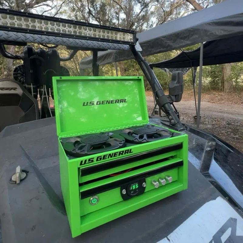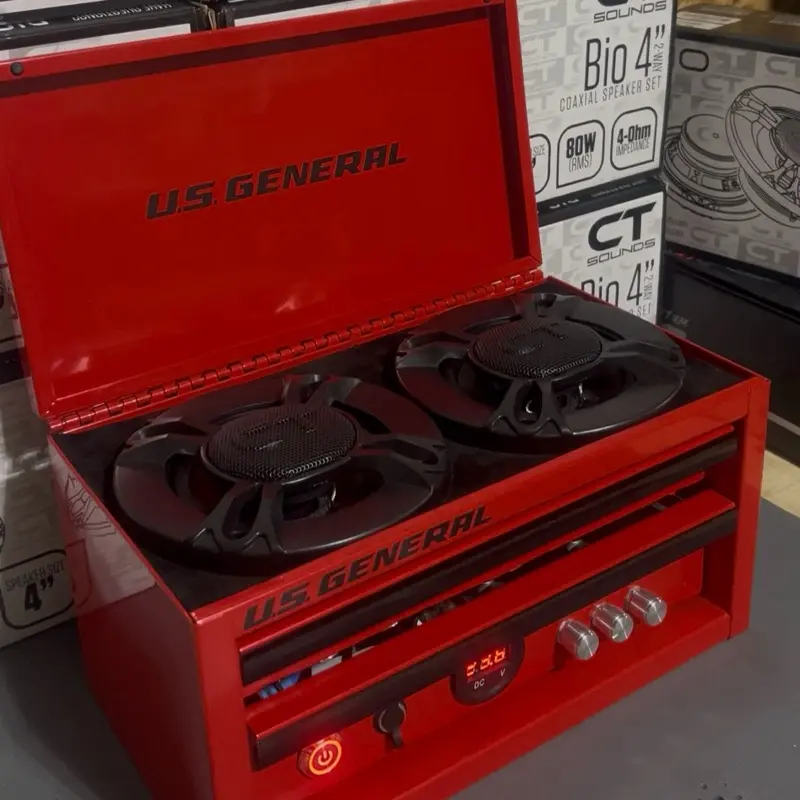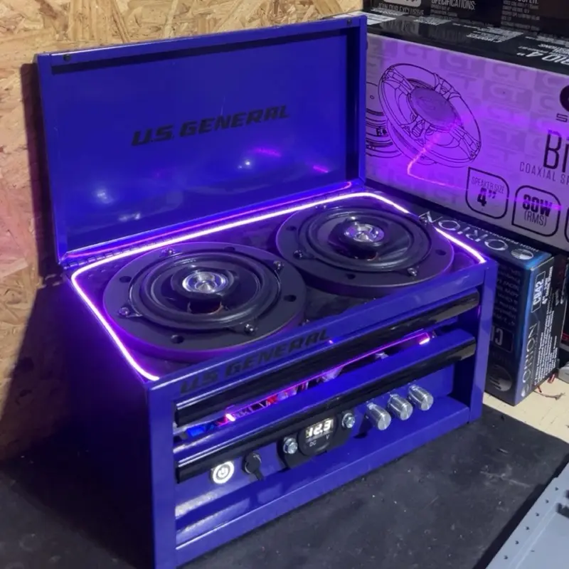 Each and every part is from Amazon, and good known name brand companies. Very customizable, with colors, lights and plenty more to make it unique and sound good doing it! Handmade every step of the way, Sound Deadening, Bluetooth Amp, the Speakers of your choice, and the list goes on. Completely Portable and Built to last! You can’t beat the sound and you definitely can’t beat the sound! Don’t buy a regular store bought speaker and come grab a toolbox! Be different!