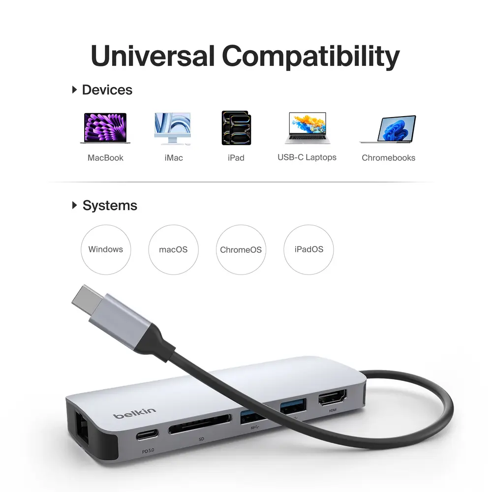Choose the Belkin CONNECT™ USB-C 6-in-1 Multiport Hub for essential connectivity on the go.
