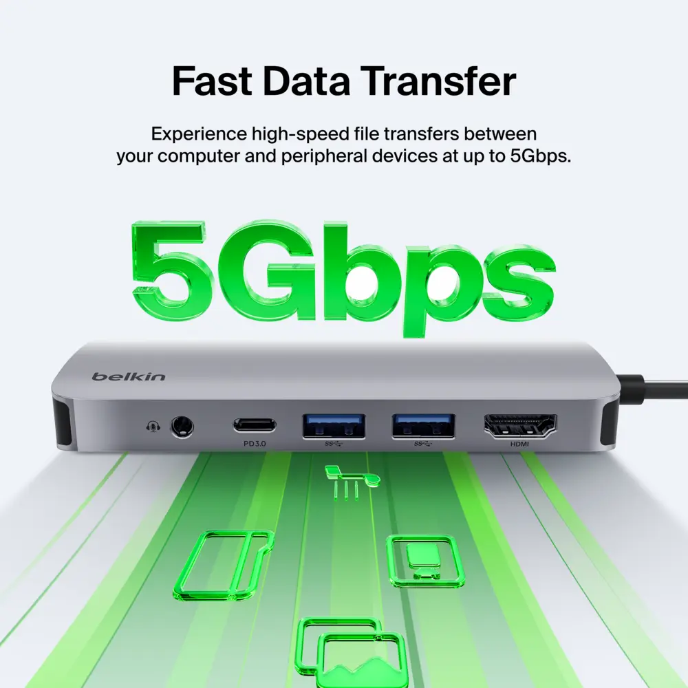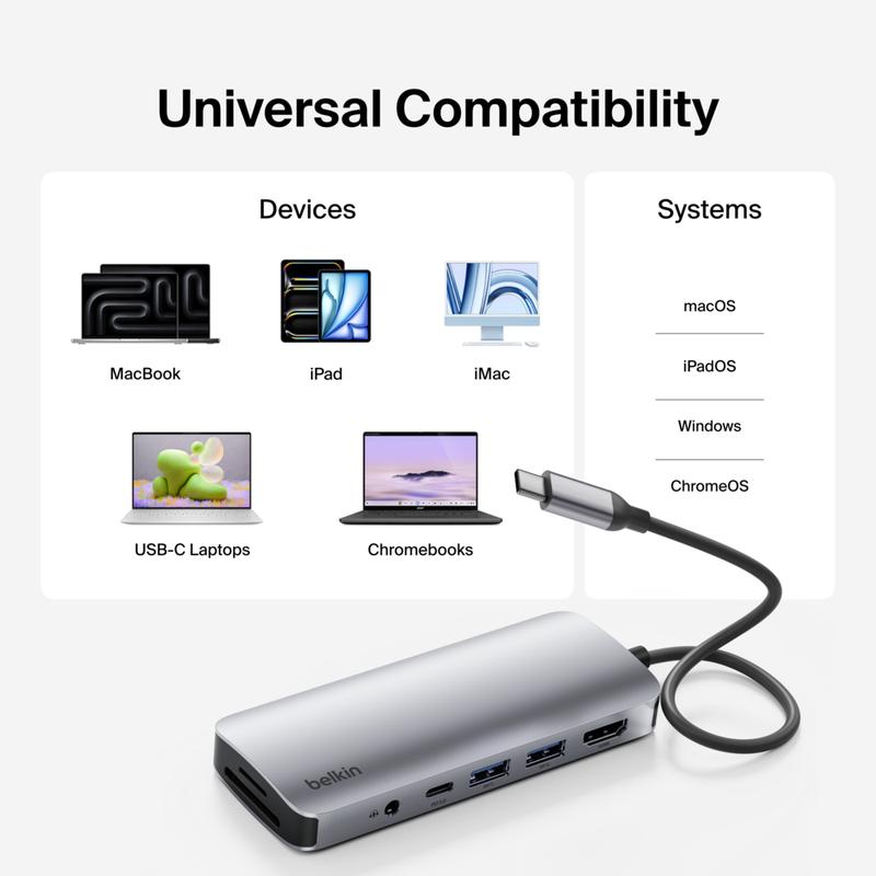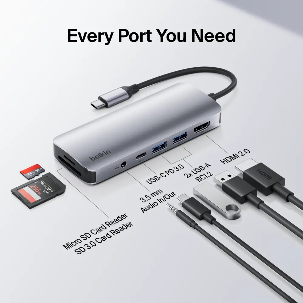 ·Connects a laptop to a HDMI port, SD and microSD slots, 1x USB-C PD 3.0 port and 2x USB-A ports through a single USB-C port