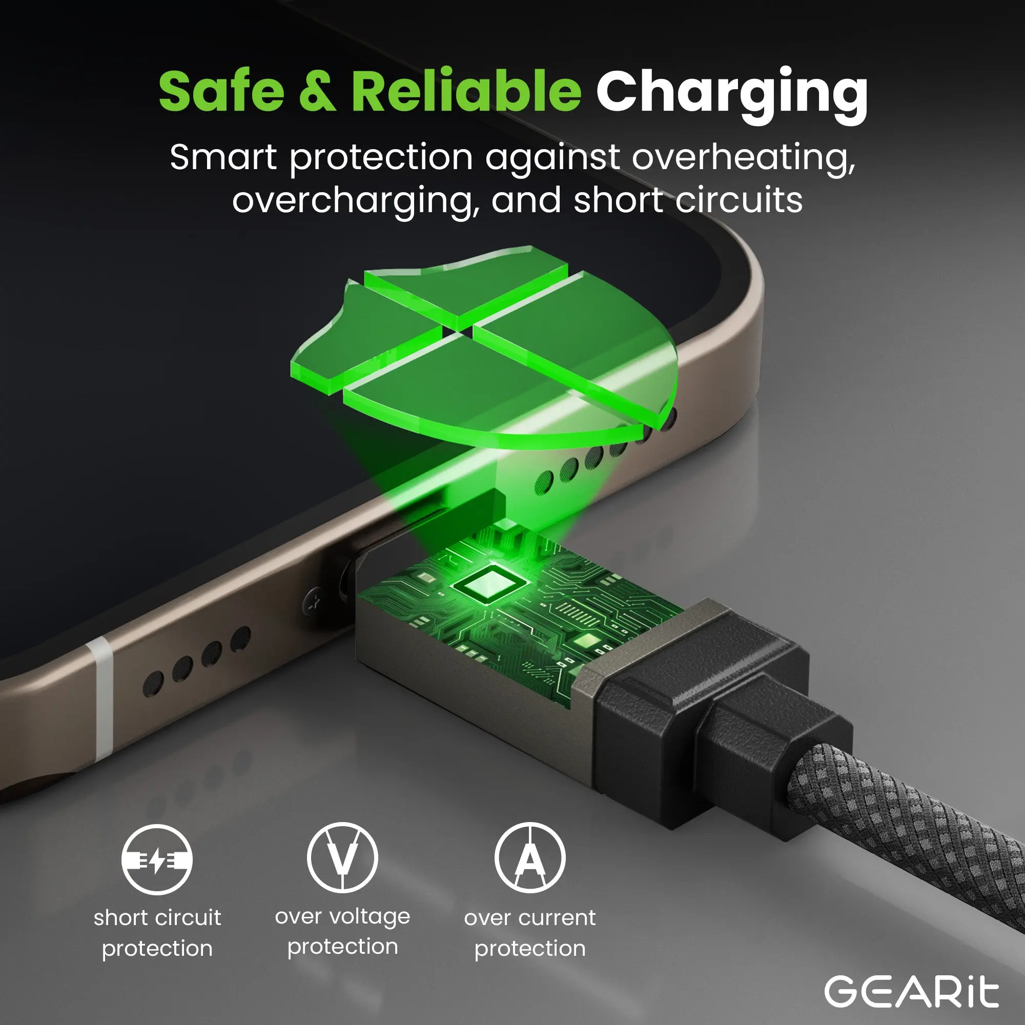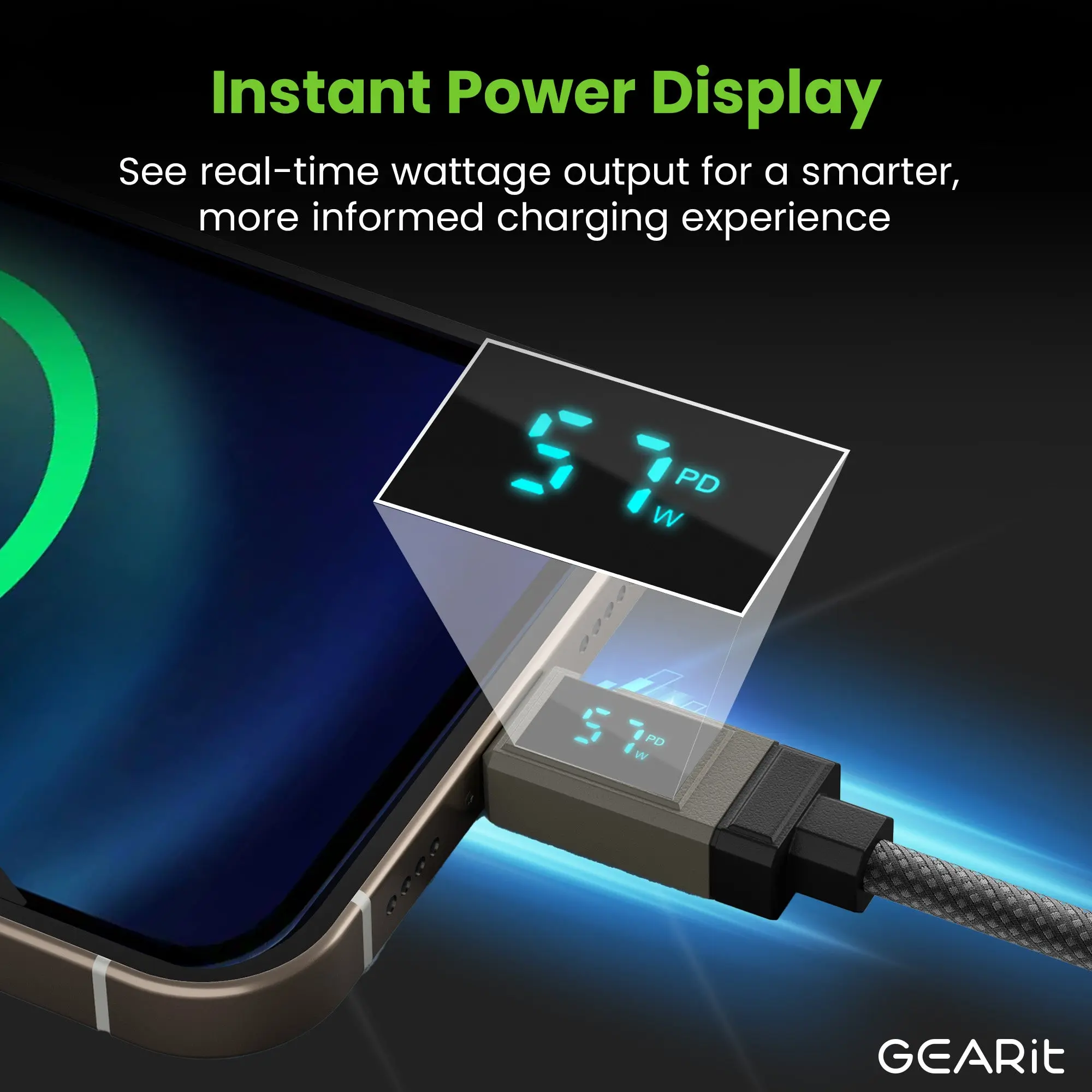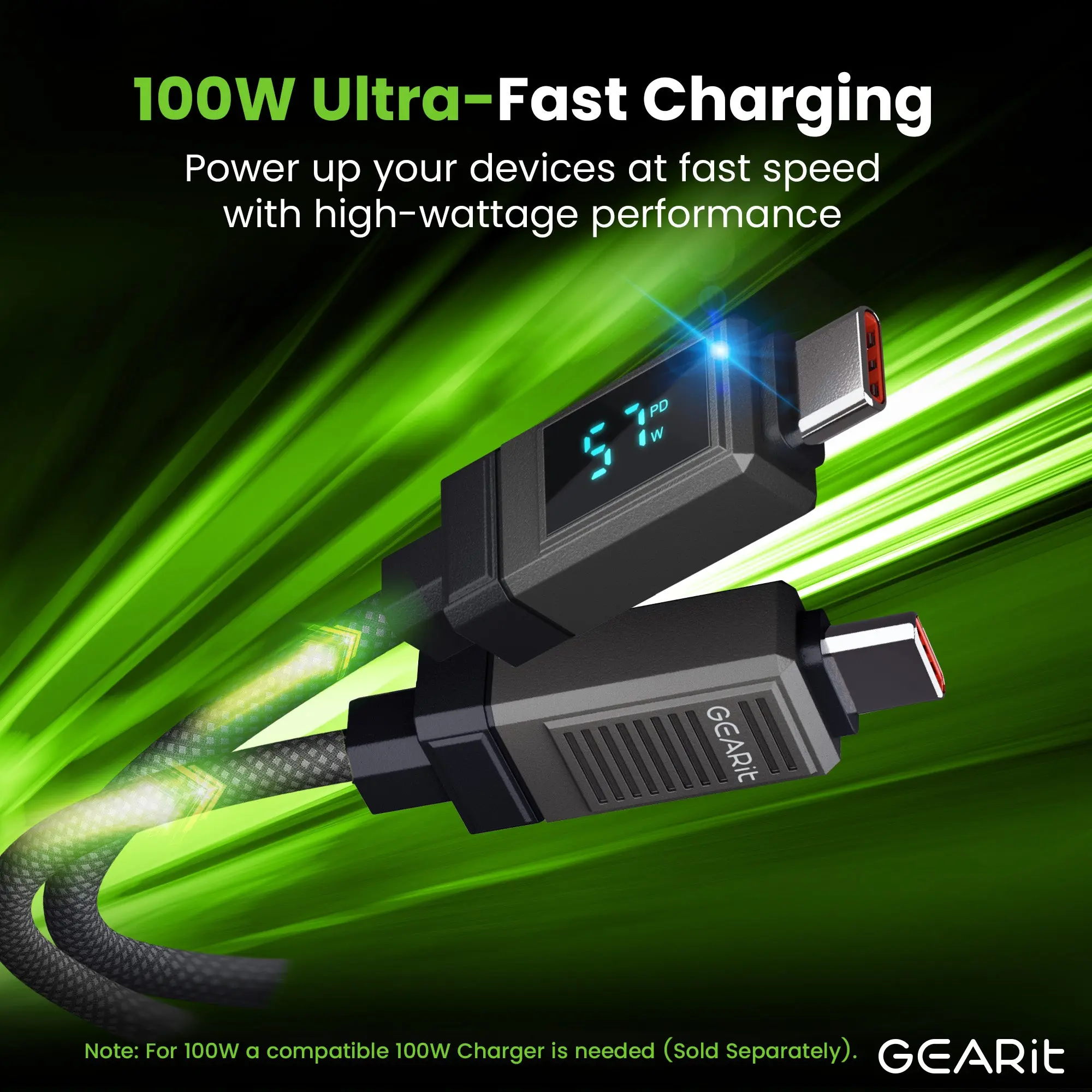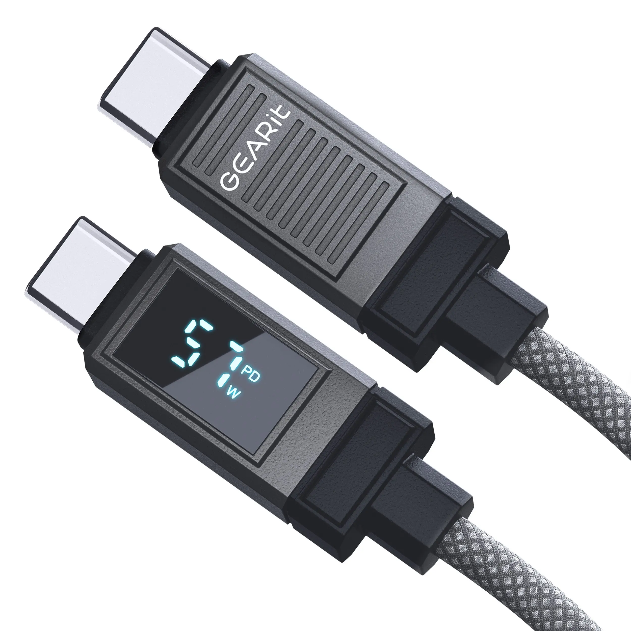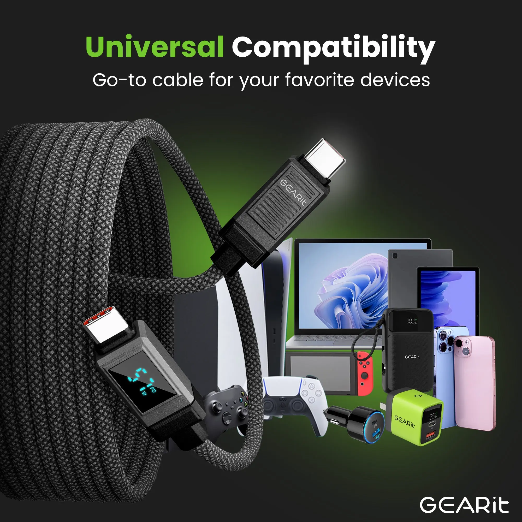 Tired of guessing if your device is charging at full speed? The GEARit Lifestyle Series 100W USB-C to USB-C cable takes the mystery out of charging with its smart digital display that shows real-time charging speeds and status. Whether you're powering up your iPhone 15, MacBook Pro, or Samsung Galaxy, enjoy blazing fast charging up to 100 watts that keeps you moving without long waits. Built tough with military-grade zinc alloy connectors and a reinforced braided cord, this 4-foot cable resists fraying and delivers reliable connections every time. Plus, the intelligent safety chip actively monitors voltage and current to protect your valuable devices from any charging risks. Compatible with all USB-C devices, this cable is your go-to for seamless, fast charging at home, work, or on the go. Inside the box, you get one 4-foot 100W USB-C to USB-C cable with smart display. Upgrade your charging game and never wonder about your power speed again—grab yours today and stay powered up effortlessly!
