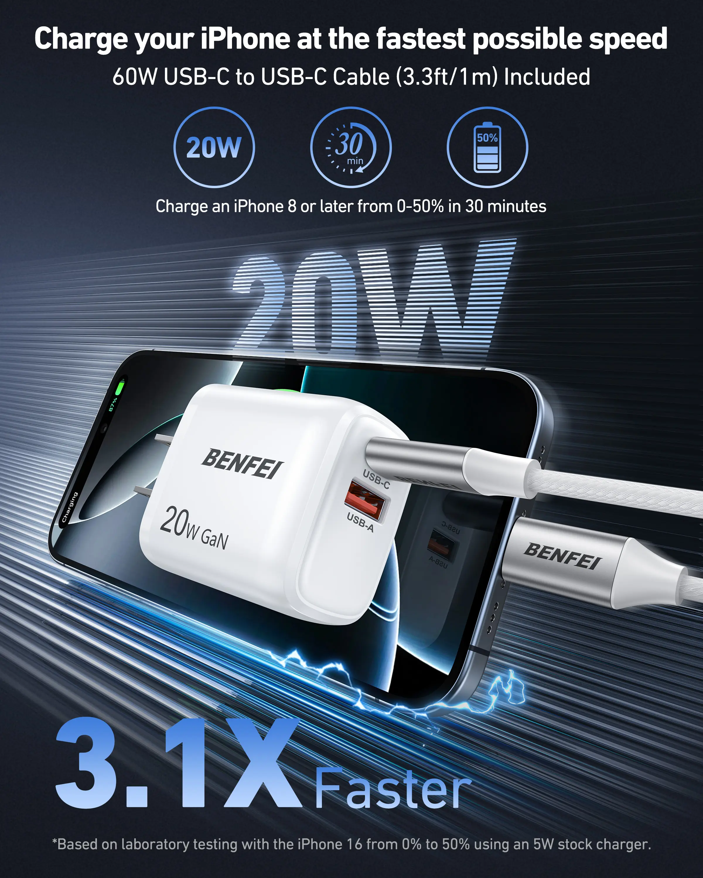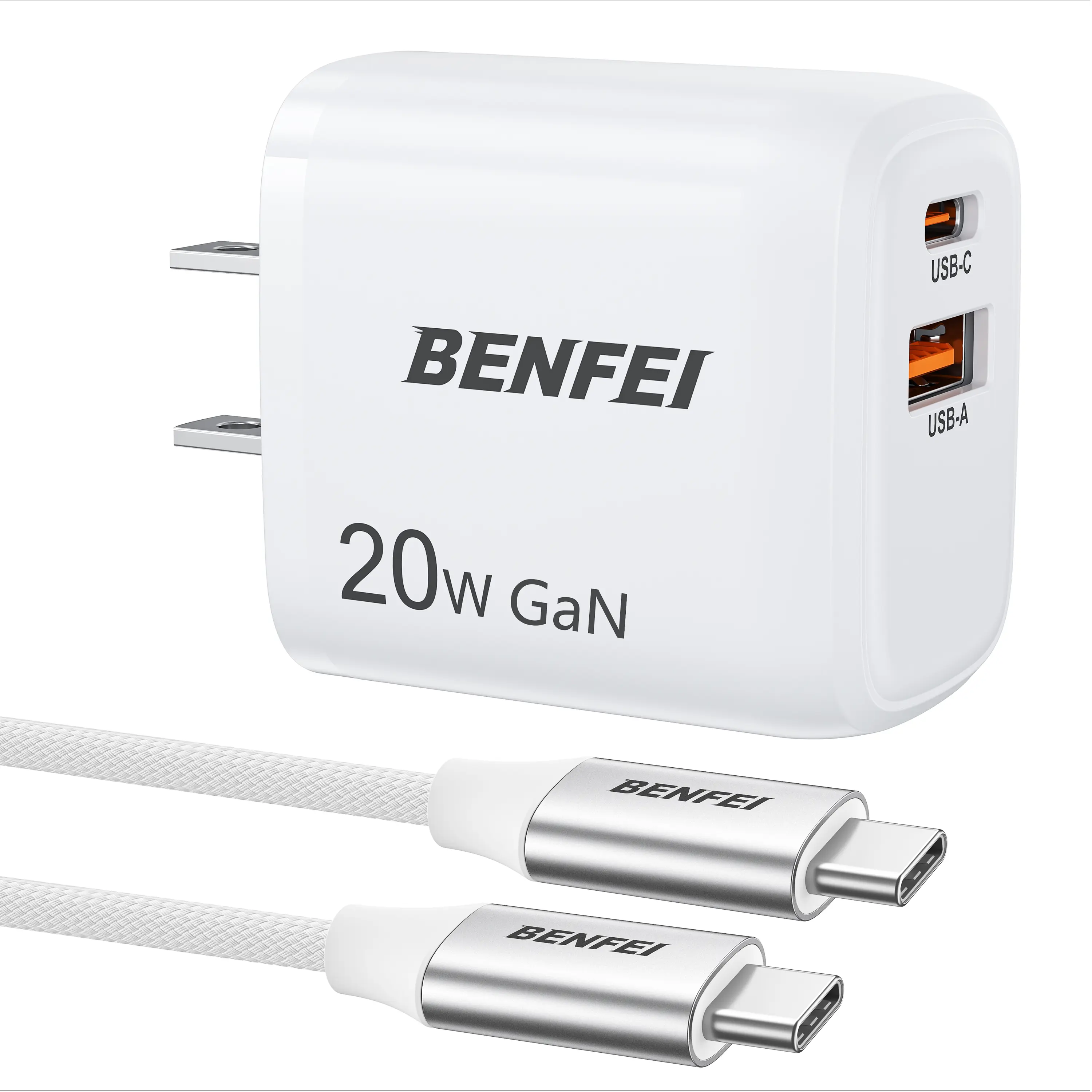 Tired of waiting forever to charge your iPhone 16 or iPad Pro? The BENFEI 20W GaN Wall Charger powers your device up to 3 times faster than the old 5W chargers, hitting 50% charge in just 25 minutes. Its compact and lightweight design makes it perfect for on-the-go charging whether at home, work, or traveling. With dual USB-C and USB-A ports, you can juice up two devices at once without losing speed, ideal for multitasking with your phone and tablet. The included 60W USB-C to USB-C cable is super durable with nylon braiding and passes over 25,000 bend tests, so it’s built to last. Plus, safety is a top priority with protections against overheating, overcharging, and short circuits, keeping your devices safe while charging. Inside the box, you get the 20W GaN charger and a 3.3ft 60W USB-C cable ready to power your USB-C devices. Ready to upgrade your charging game? Grab this sleek charger and enjoy fast, reliable power wherever you go!