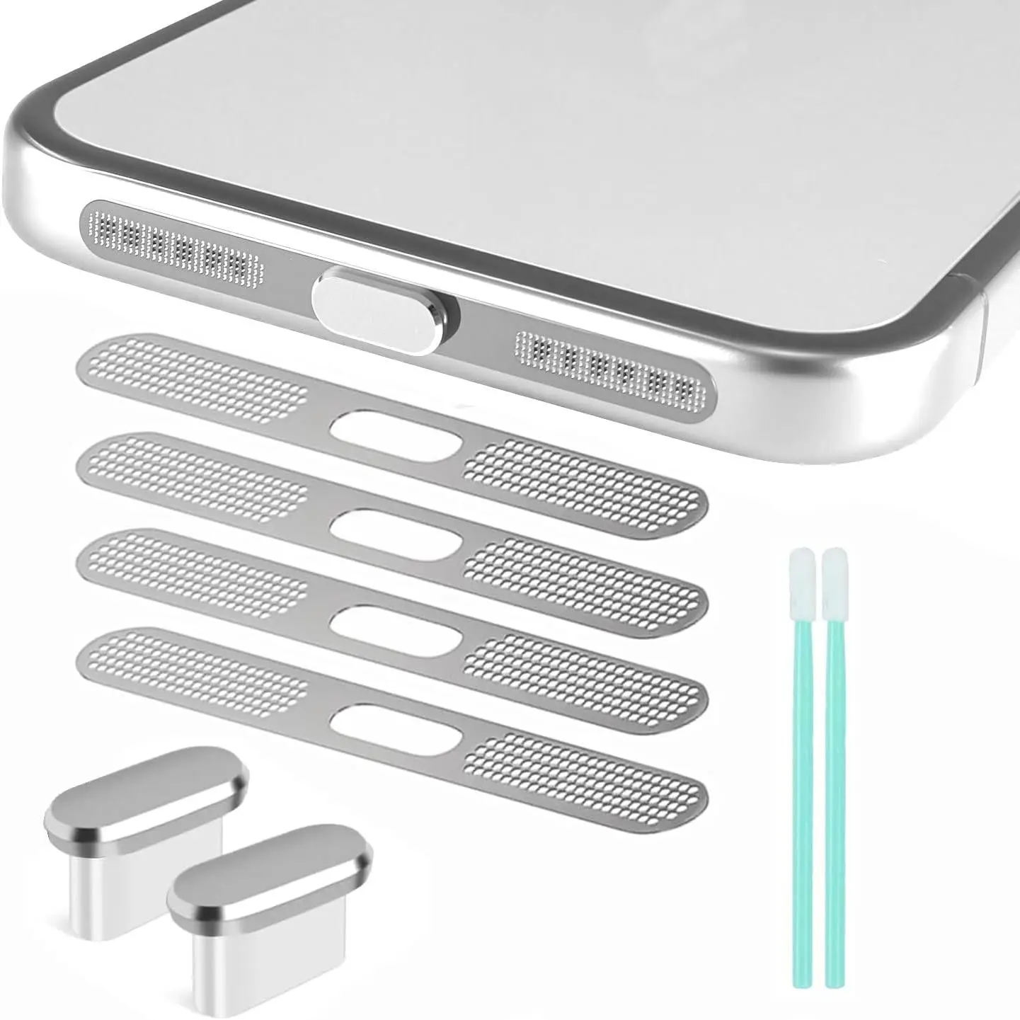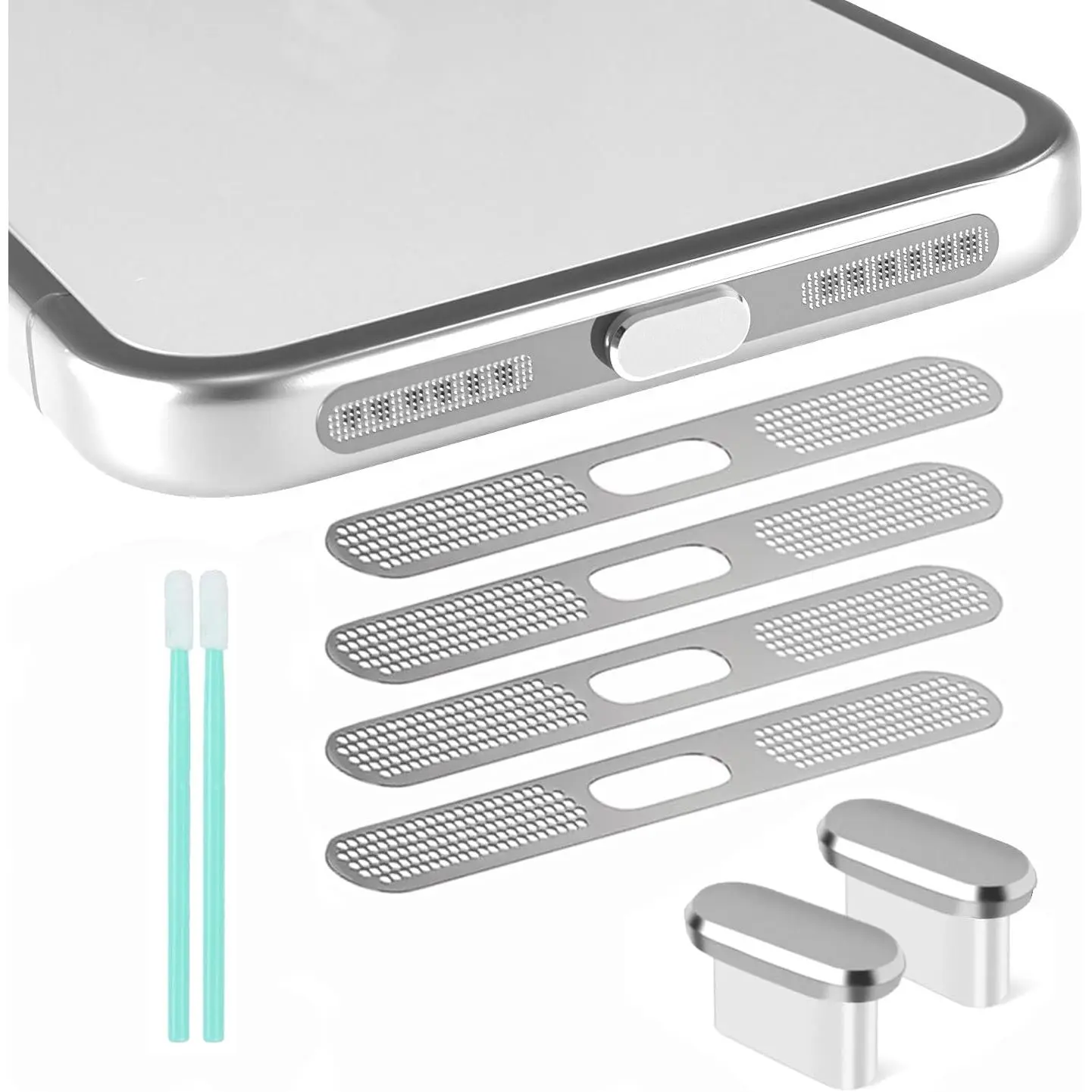 Package Includes: You will get 2 count of USB C dust plugs, 2 count of clean swabs, 4 count of phone metal speaker mesh for 17 Pro