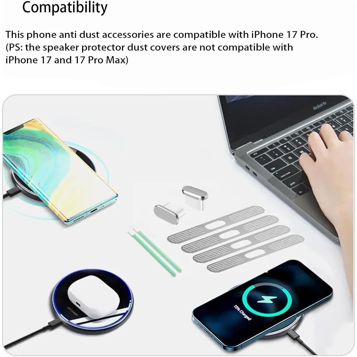This phone anti dust accessories are compatible with 17 Pro. (PS: the speaker protector dust covers are not compatible with 17 and 17 Pro Max)