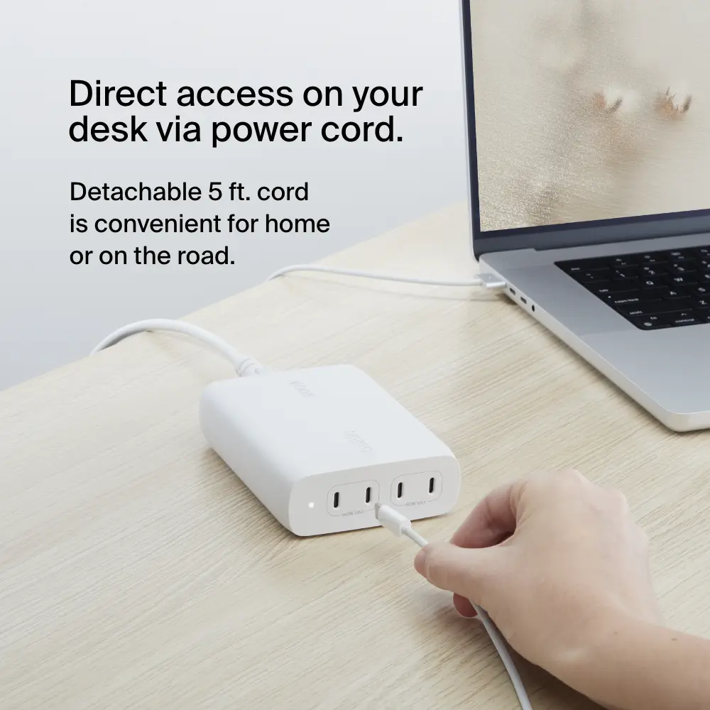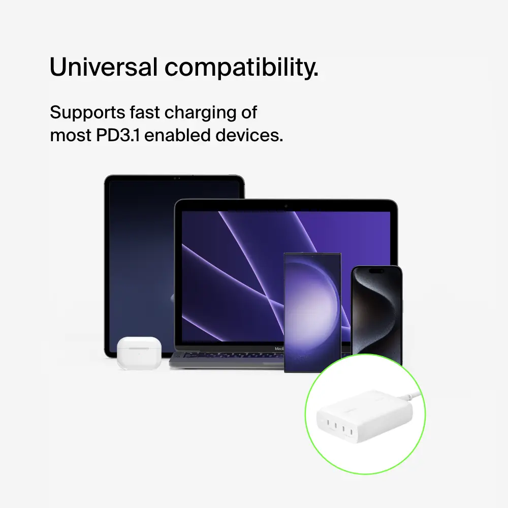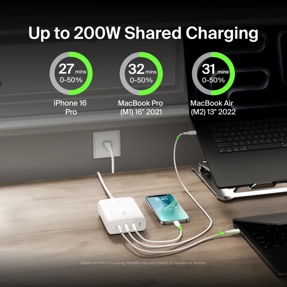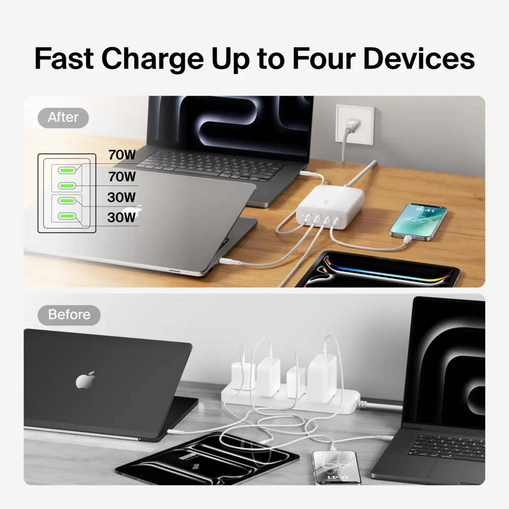 Power up your devices quickly and efficiently with our 200W 4-Port Desktop GaN Charger. Charge up to four devices simultaneously, including your iPhone 15 Pro and MacBook Pro 16"", with intelligent power sharing for optimal charging.