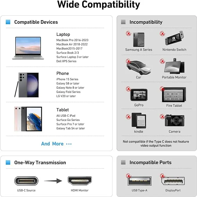·SUPERIOR STABILITY - Built-in advanced IC chip converts USB-C digital signal to HDMI signal; Please pay attention, the USB-C device should support the USB Type-C DP Alt mode.