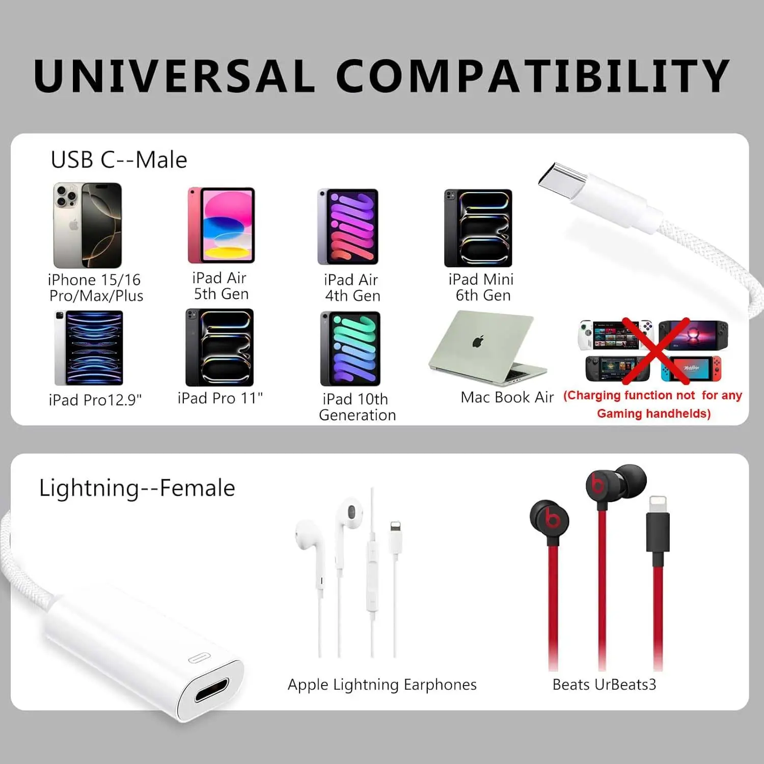 ·3 in 1 Function: This USB C to Lightning Adapter combine Fast Charging, Data Transfer and Headphone Audio Adapter together. You can easy connect the adapter to USB C device for Charging and Data Transfer by using a Lightning Cable. You can also listen audio from USB C device by lightning earphone with this USB C to Lightning Adapter【Note】Not compatible with gaming handhelds/Switch/Steam Deck/Rog Ally