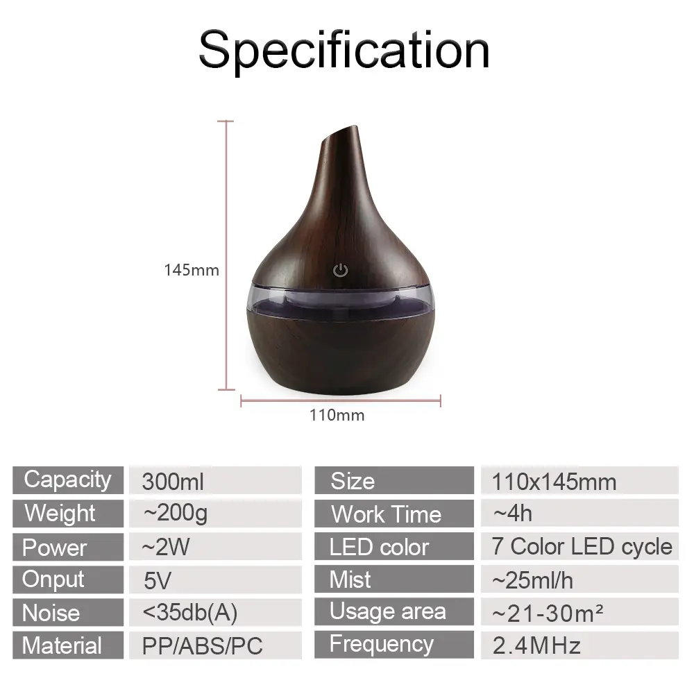 5. 300ml USB Humidifier & Essential Oil Diffuser, Wood Grain Design Cool Mist for Home, Office, Desktop Includes 2 Aroma Oils