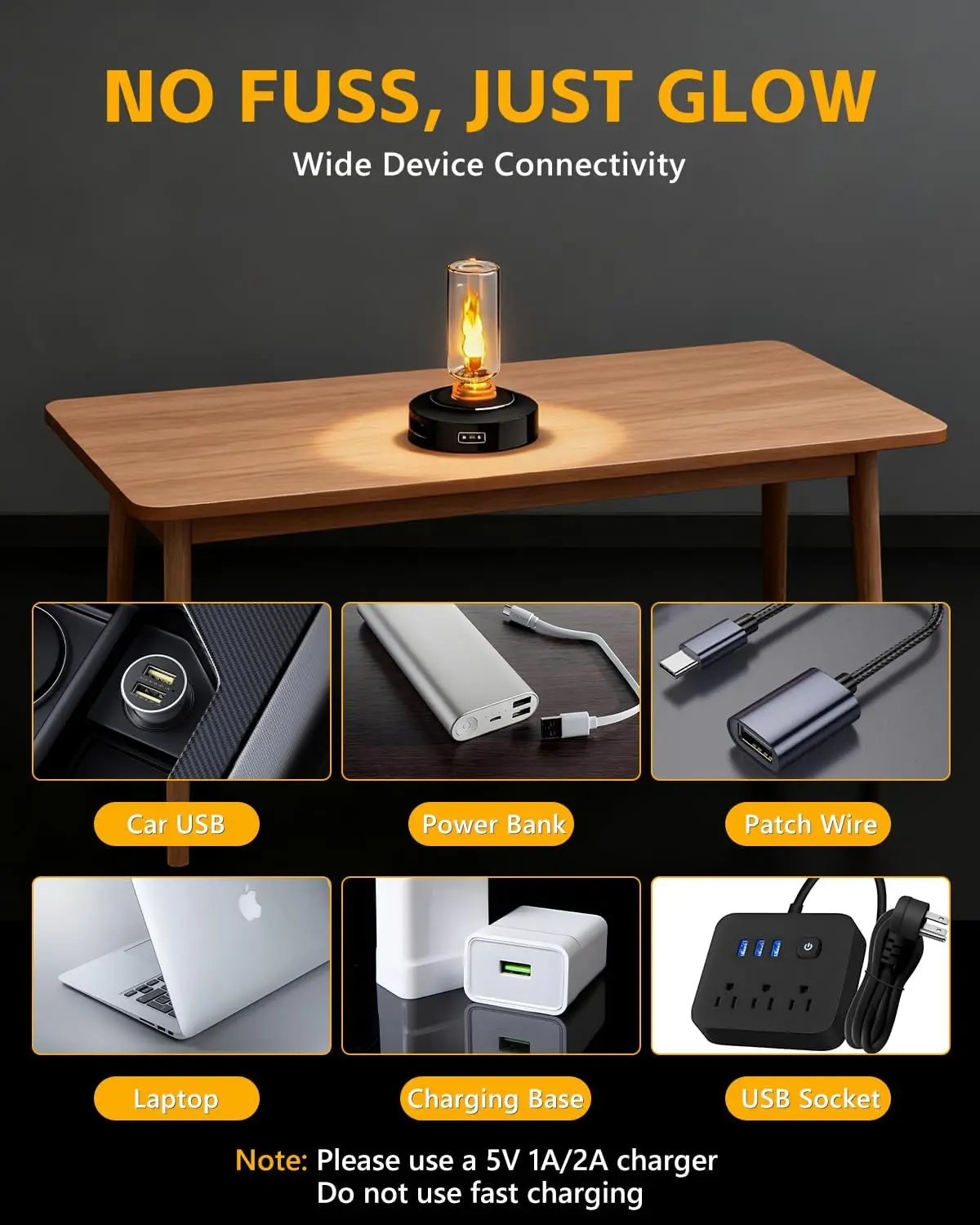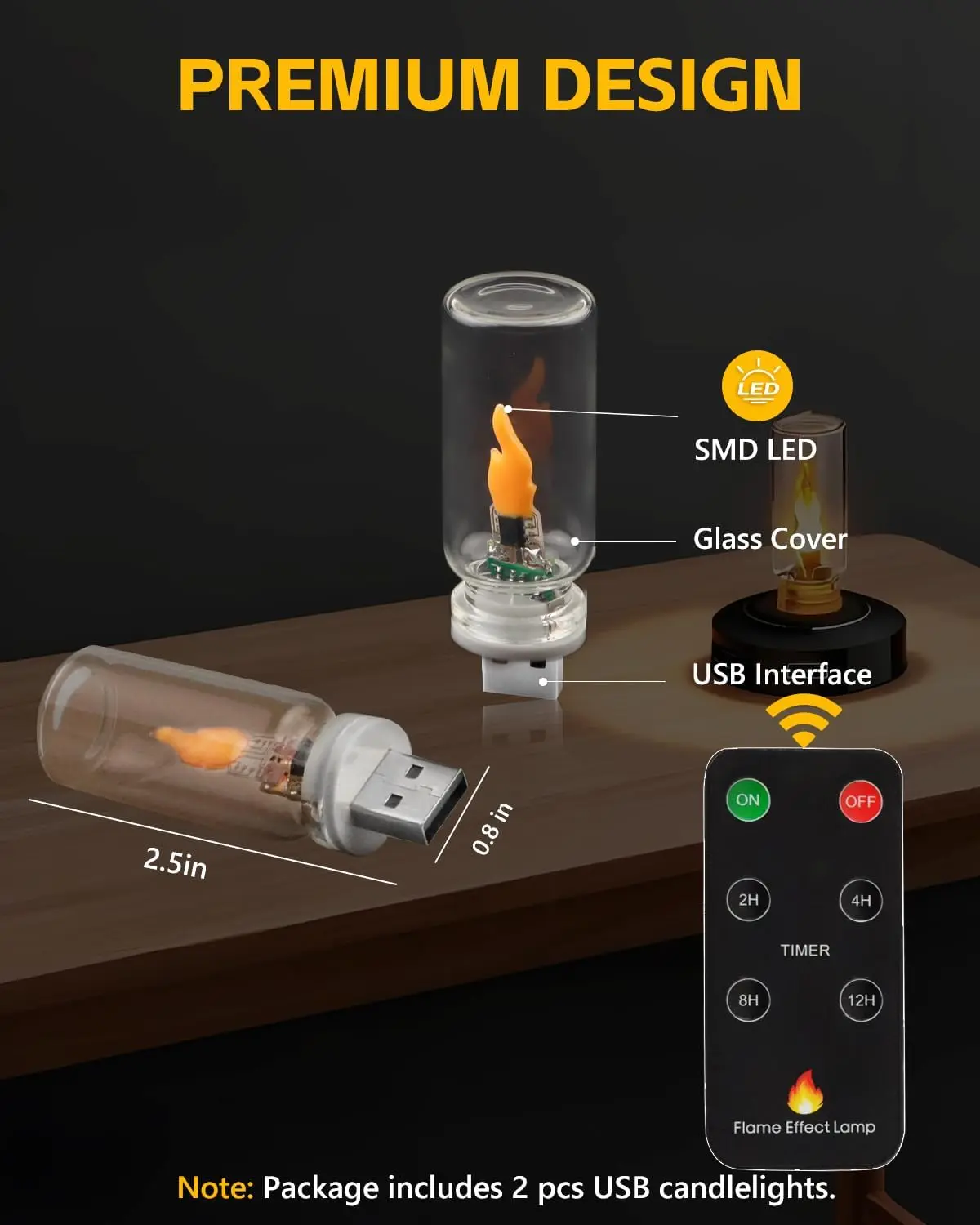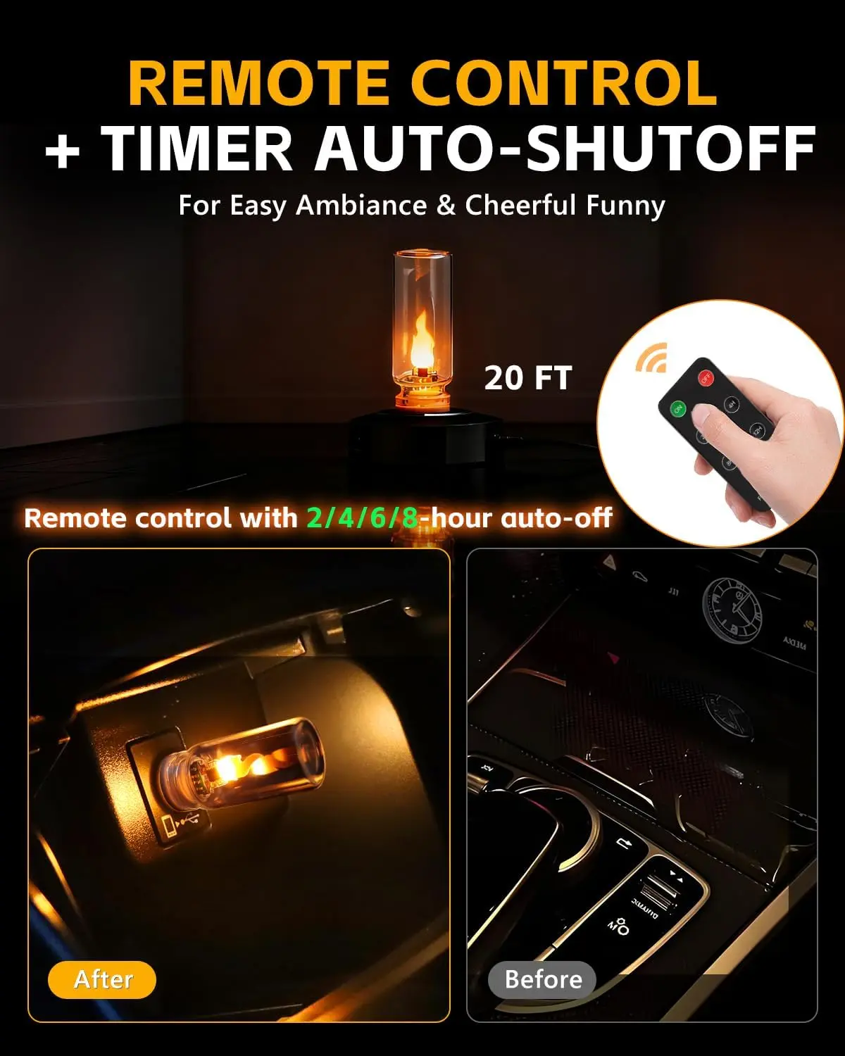 Upgrade your car's ambiance with these 2 PCS USB lights. Perfect for car, camping, and parties, these LED flame lights add a cozy glow. 🌟 Features include a remote control and auto-off timer for convenience. Plug them in via USB for easy installation. These mini retro glass night lights are ideal for bedrooms too. Enhance your space with these versatile lights.